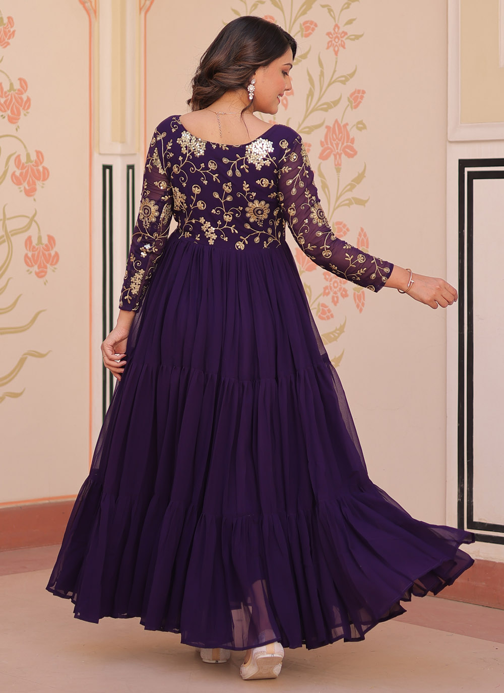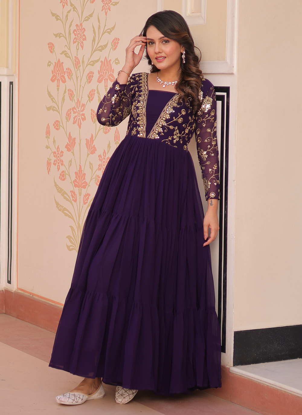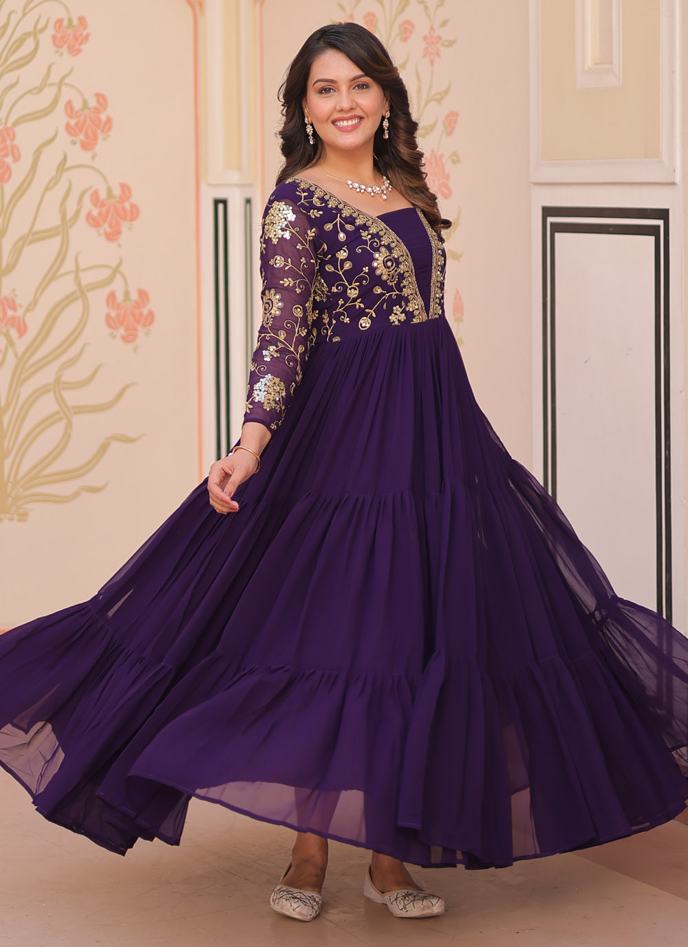 Make a chic statement in this faux georgette purple gown featuring delicate sequin embroidery that adds a touch of brilliance. The lightweight fabric and sleek cut combine heritage-inspired embellishments with modern style, perfect for weddings and festive soirées.