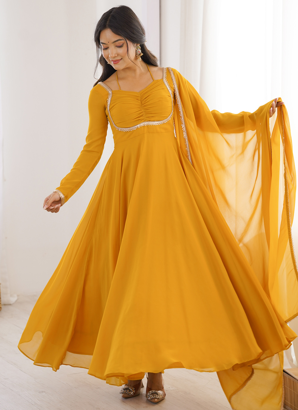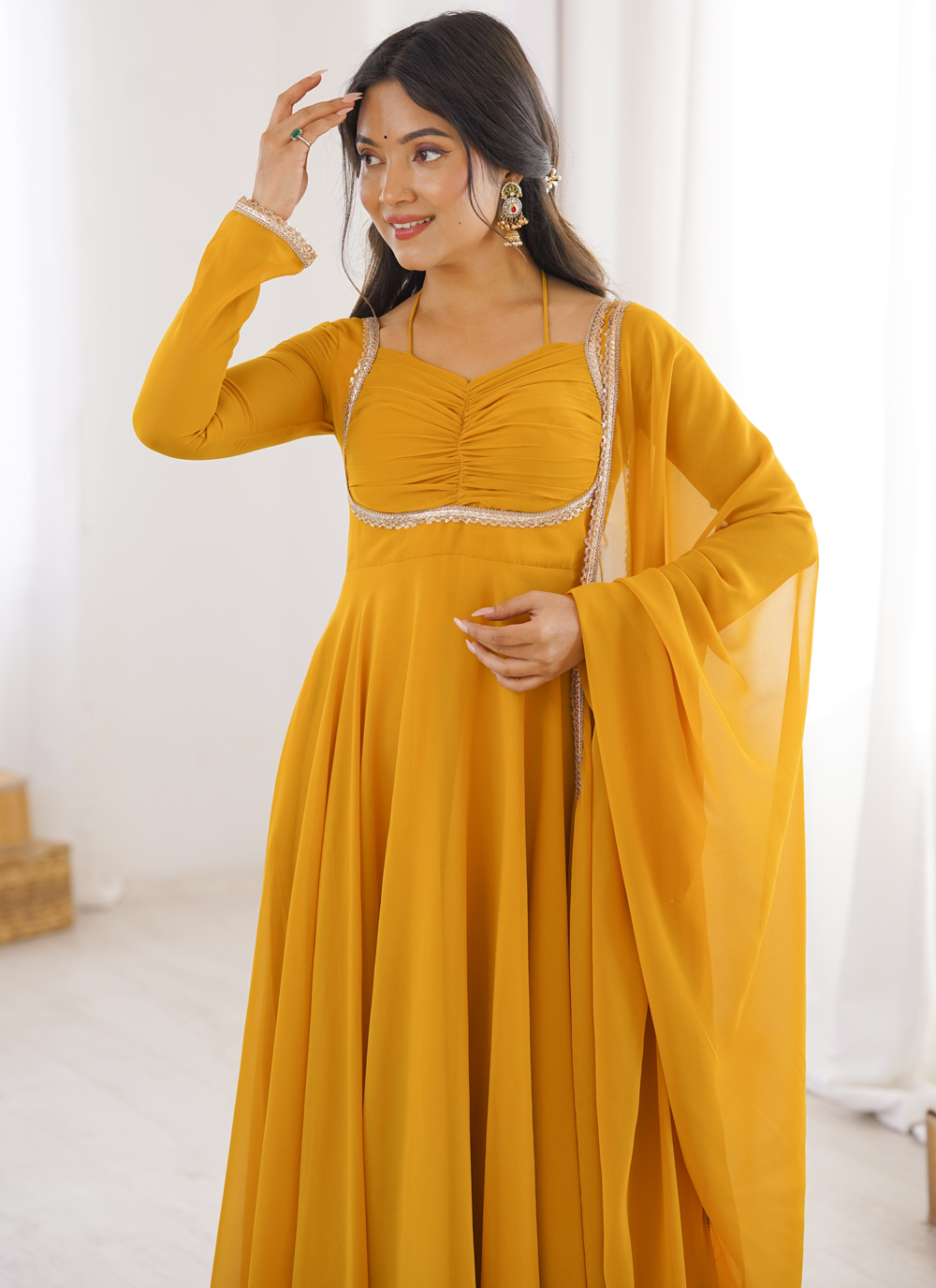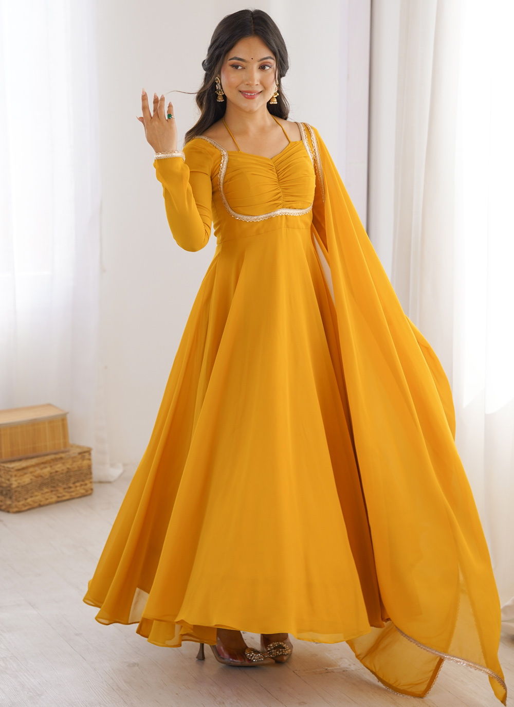 Brighten up your festive wardrobe with this yellow faux georgette trendy gown, beautifully adorned with fancy lace work. The cheerful yellow hue adds a vibrant touch, while the delicate detailing enhances its elegant appeal. Comes with matching dupatta.