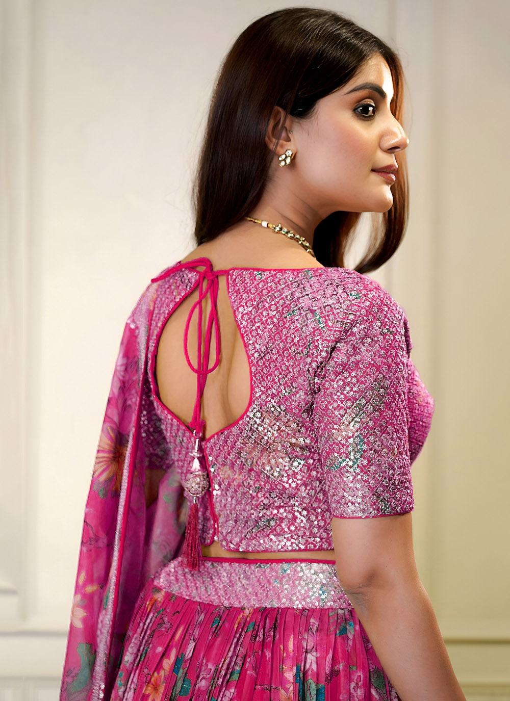 This Pink organza lehenga choli is designed to add soft elegance to ceremonial occasions. The outfit features delicate floral print work enhanced with fine sequins and zari embroidery, creating a graceful and festive look. Comes with matching choli and dupatta.