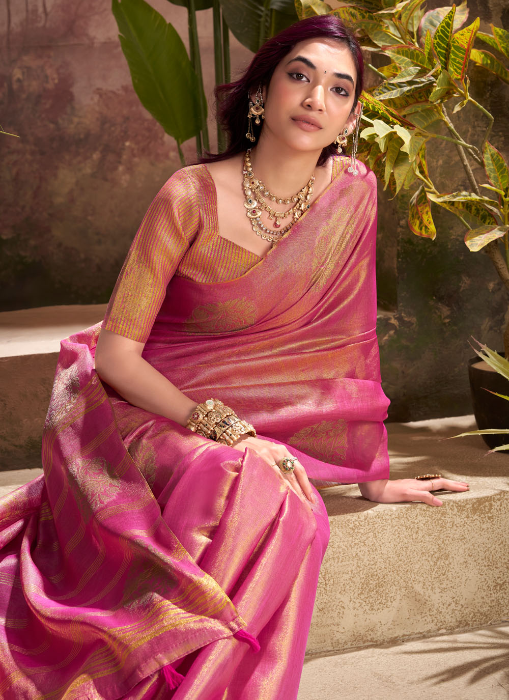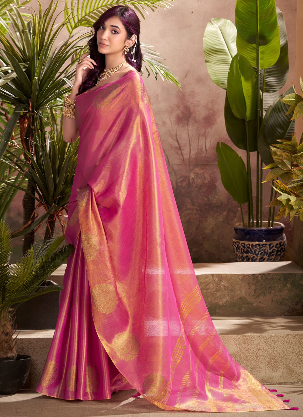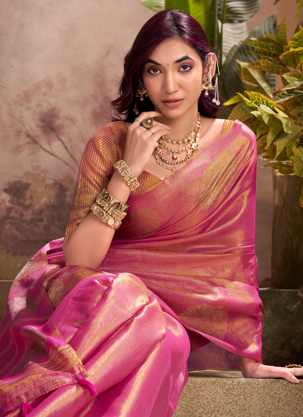Brighten up your ethnic wardrobe with this statement-making fuchsia tissue silk saree. Designed with intricate woven work, it offers a lightweight feel and a radiant drape. Comes with matching blouse.