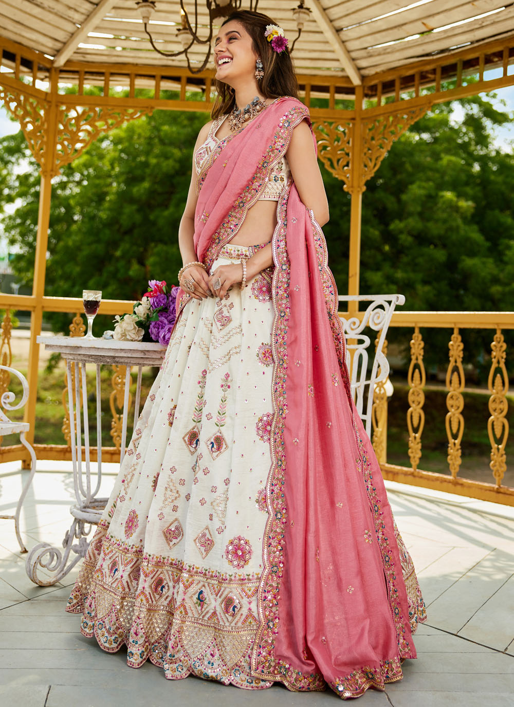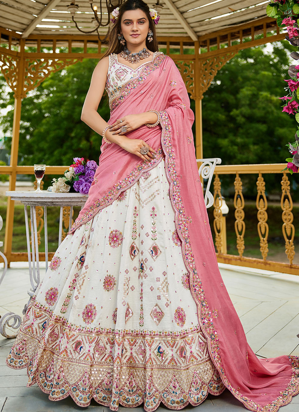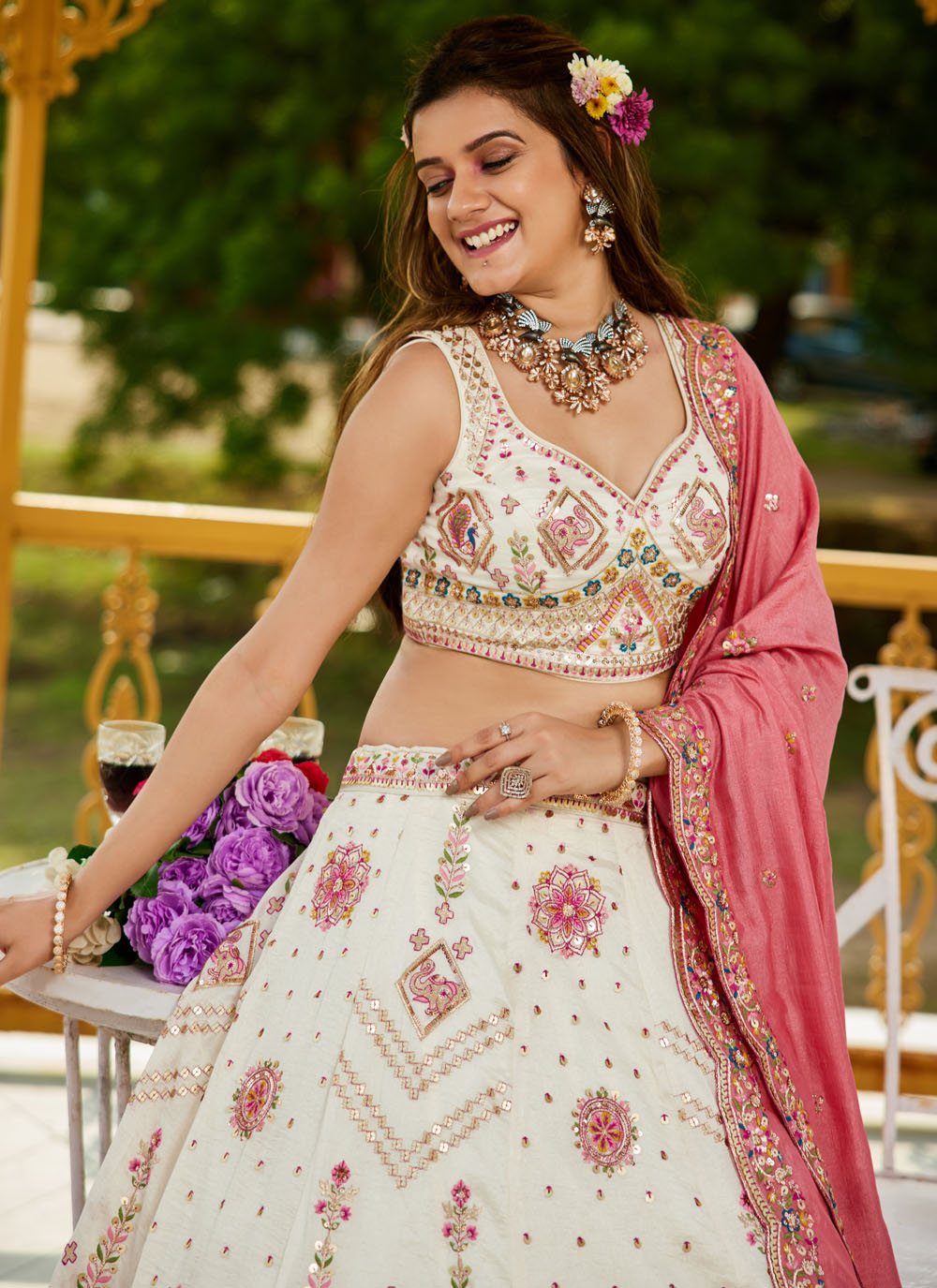 Grace meets glamour in this cream georgette lehenga choli, elegantly adorned with fine thread embroidery and subtle sequin work. A serene pick for ceremonial occasions and pre-wedding rituals. Comes with matching choli and dupatta.