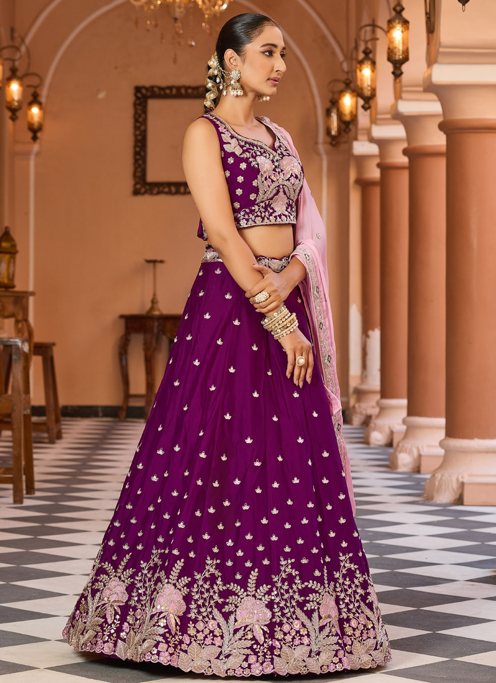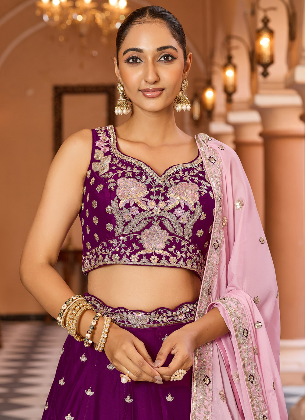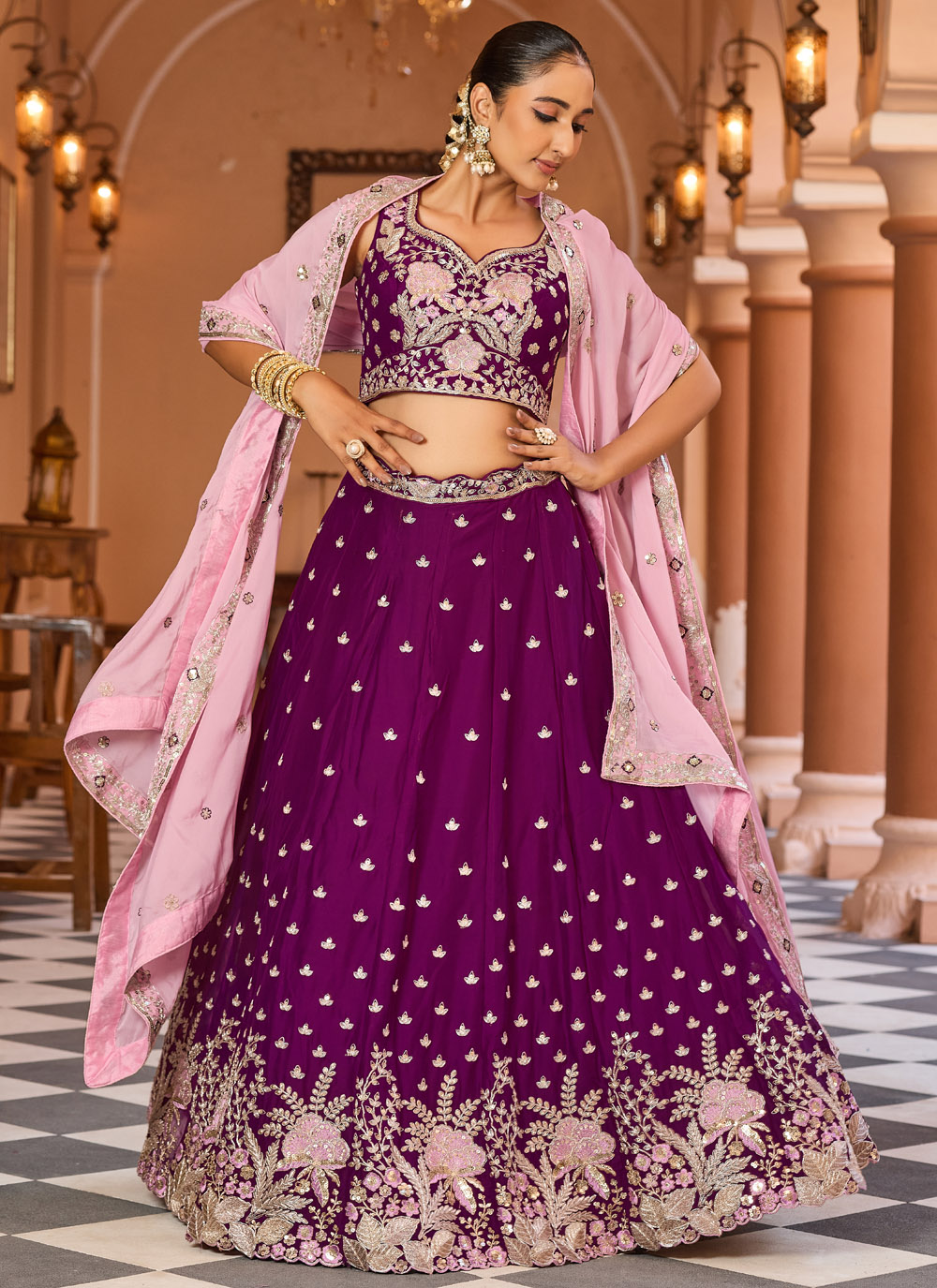 The vibrant purple hue combined with shimmering sequins gives this lehenga choli an eye-catching appeal. Designed especially for Sangeet functions, it blends elegance and modern charm effortlessly, making you shine through the celebration. Comes with matching choli and dupatta.