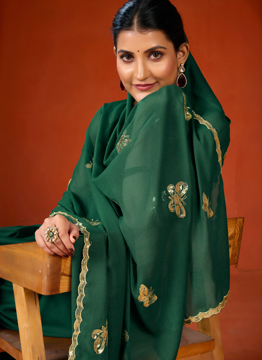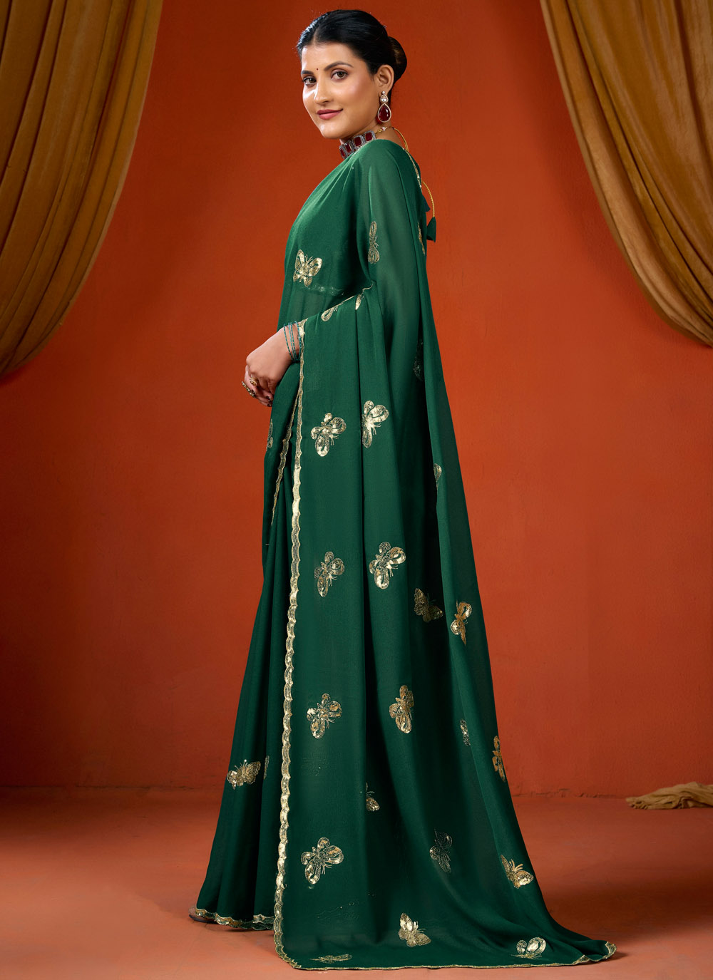 This Georgette Green Sequins Work Saree is designed for women who love simple yet stylish ethnic wear. The refreshing green shade paired with delicate sequins creates a relaxed and elegant appearance. Comes with matching blouse.