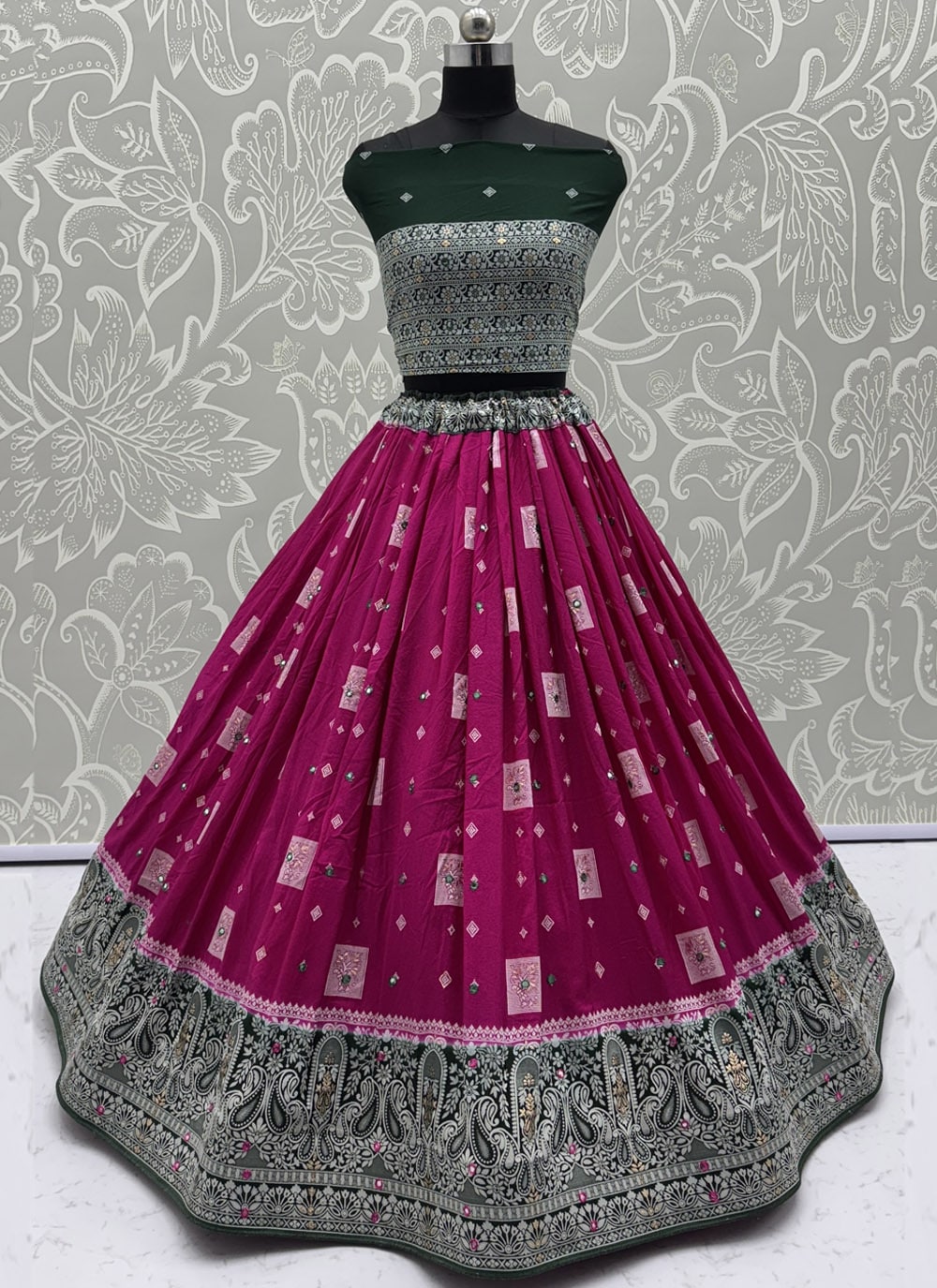 Twirl into the spotlight with this elegant Rani Colour Lehenga Choli. The flowy Georgette fabric and stunning Jacquard weaving are beautifully complemented by shimmering mirror work, ensuring you radiate grace and stand out with a captivating sparkle. Comes with matching choli and dupatta.