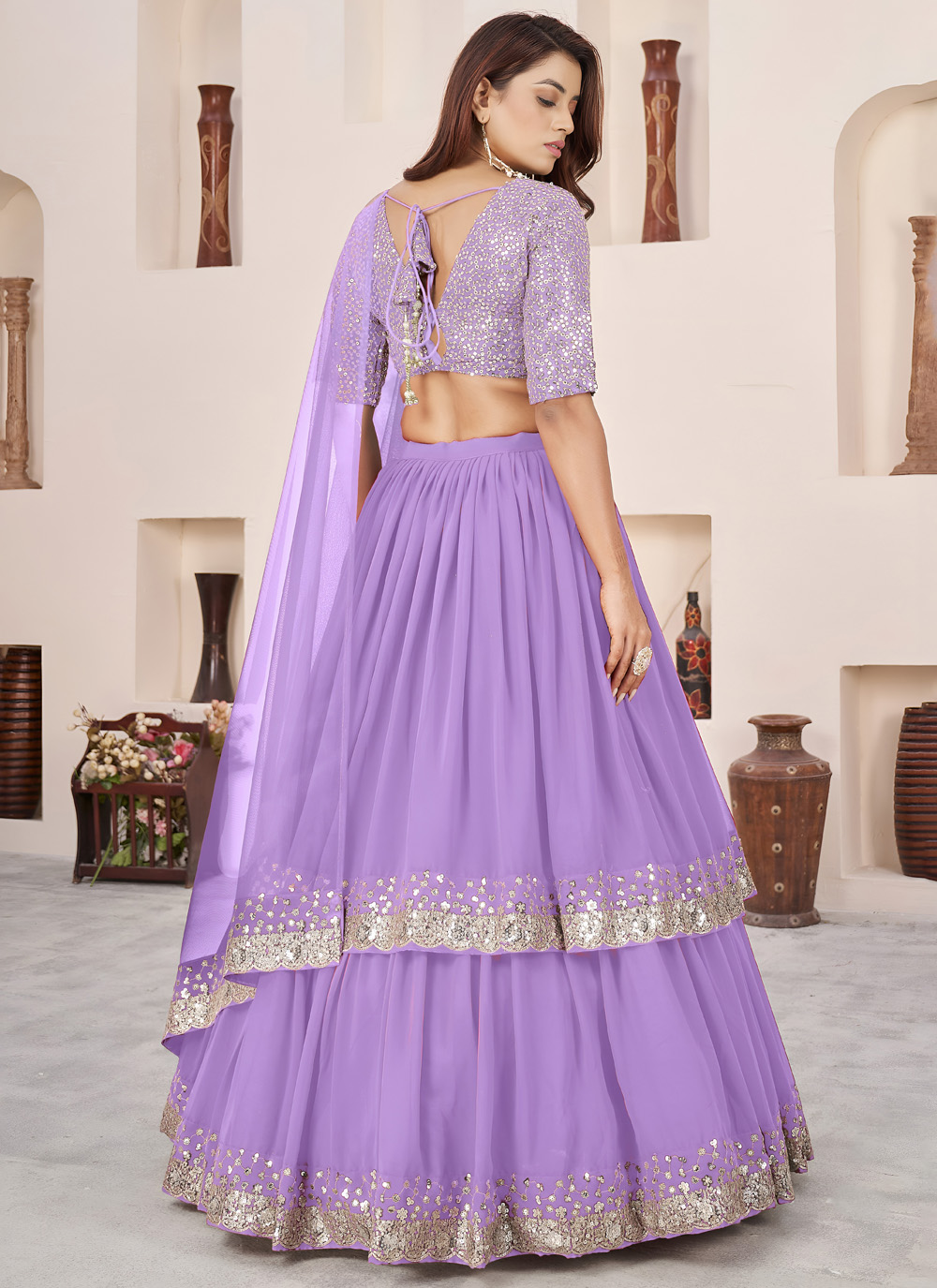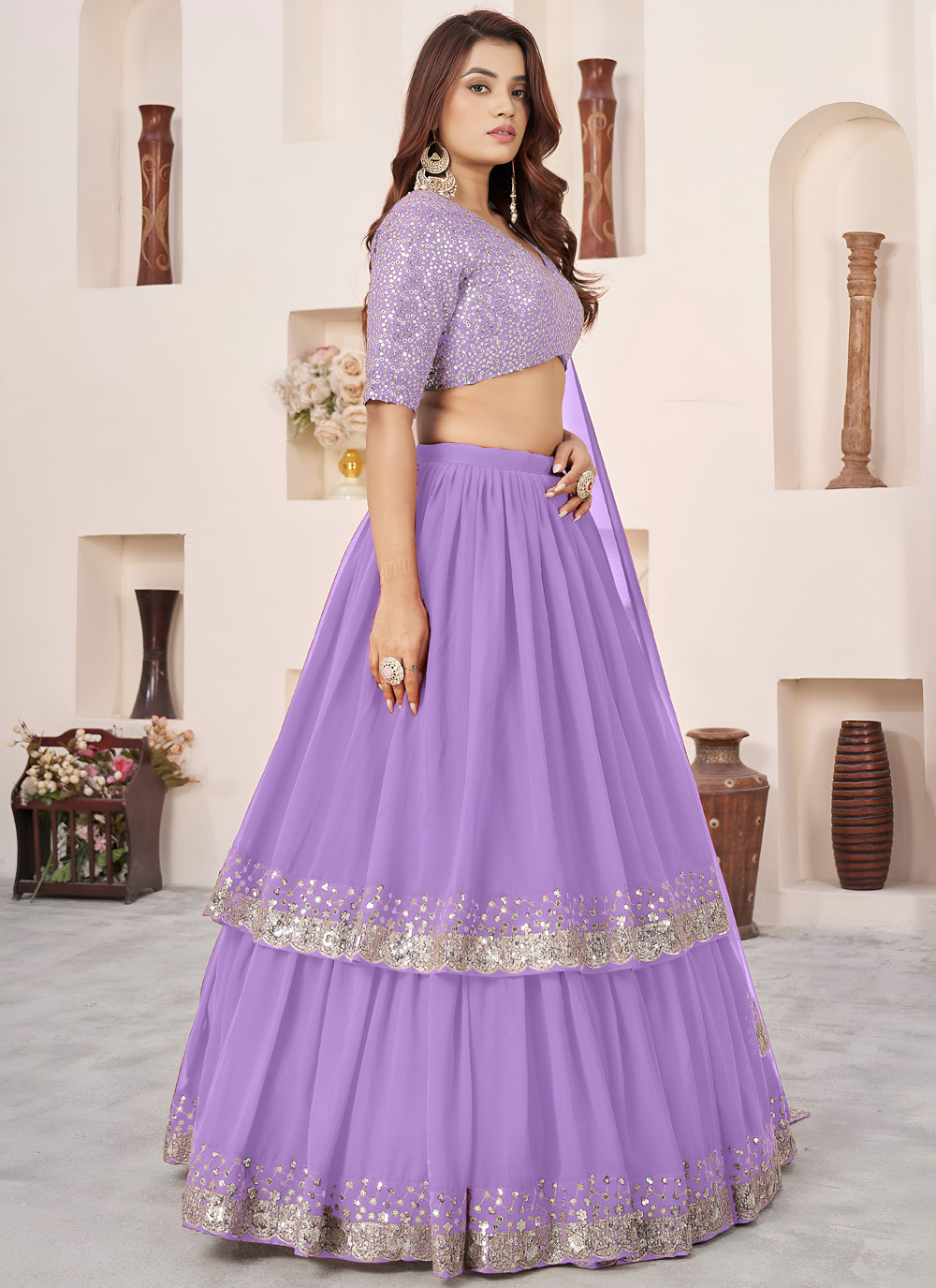 This designer lavender lehenga choli blends traditional embroidery with a contemporary colour palette. Crafted in georgette with sequins zari work, it offers a stylish and graceful look for grand celebrations. Comes with matching choli and dupatta.