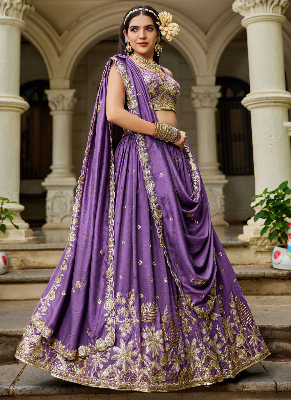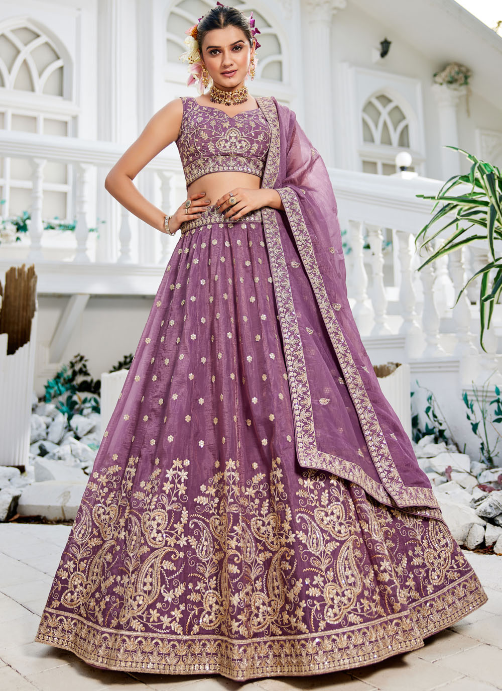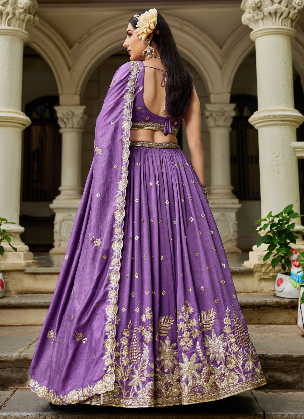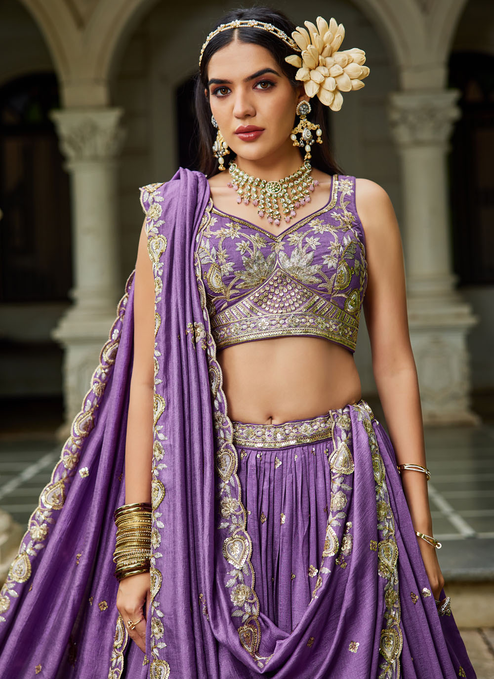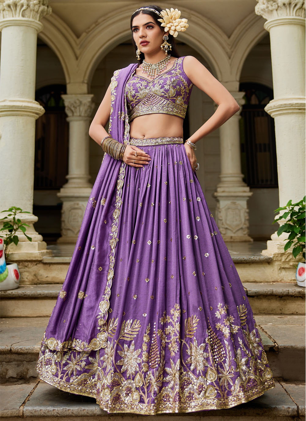 This lavender georgette lehenga choli features exquisite thread embroidery that creates a graceful and regal aesthetic. Its soft pastel hue and refined craftsmanship make it a stylish choice for festive and bridal occasions. Comes with matching choli and dupatta.