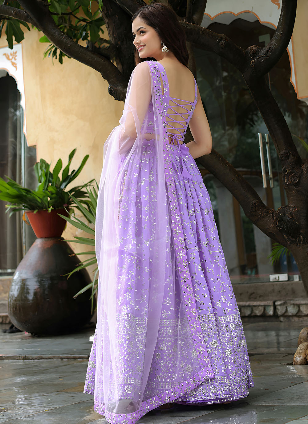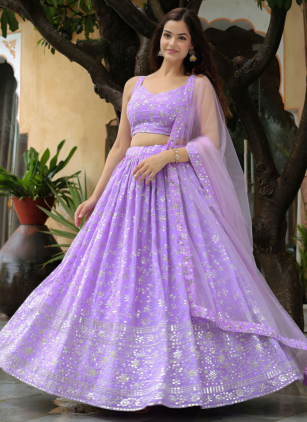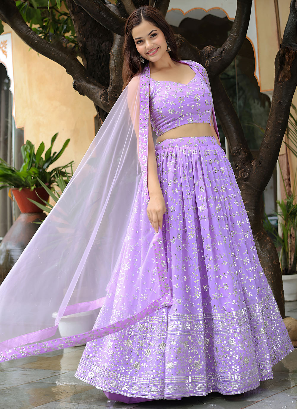 This Georgette Lavender Lehenga Choli is a celebration of feminine grace. The delicate zari work intertwined with sequins creates a shimmering effect that catches every ray of light. Soft, flowy and effortlessly elegant. Comes with matching choli and dupatta.
