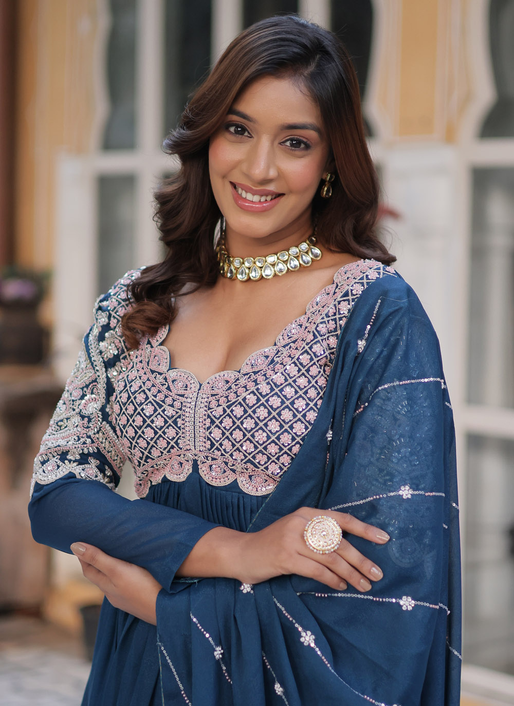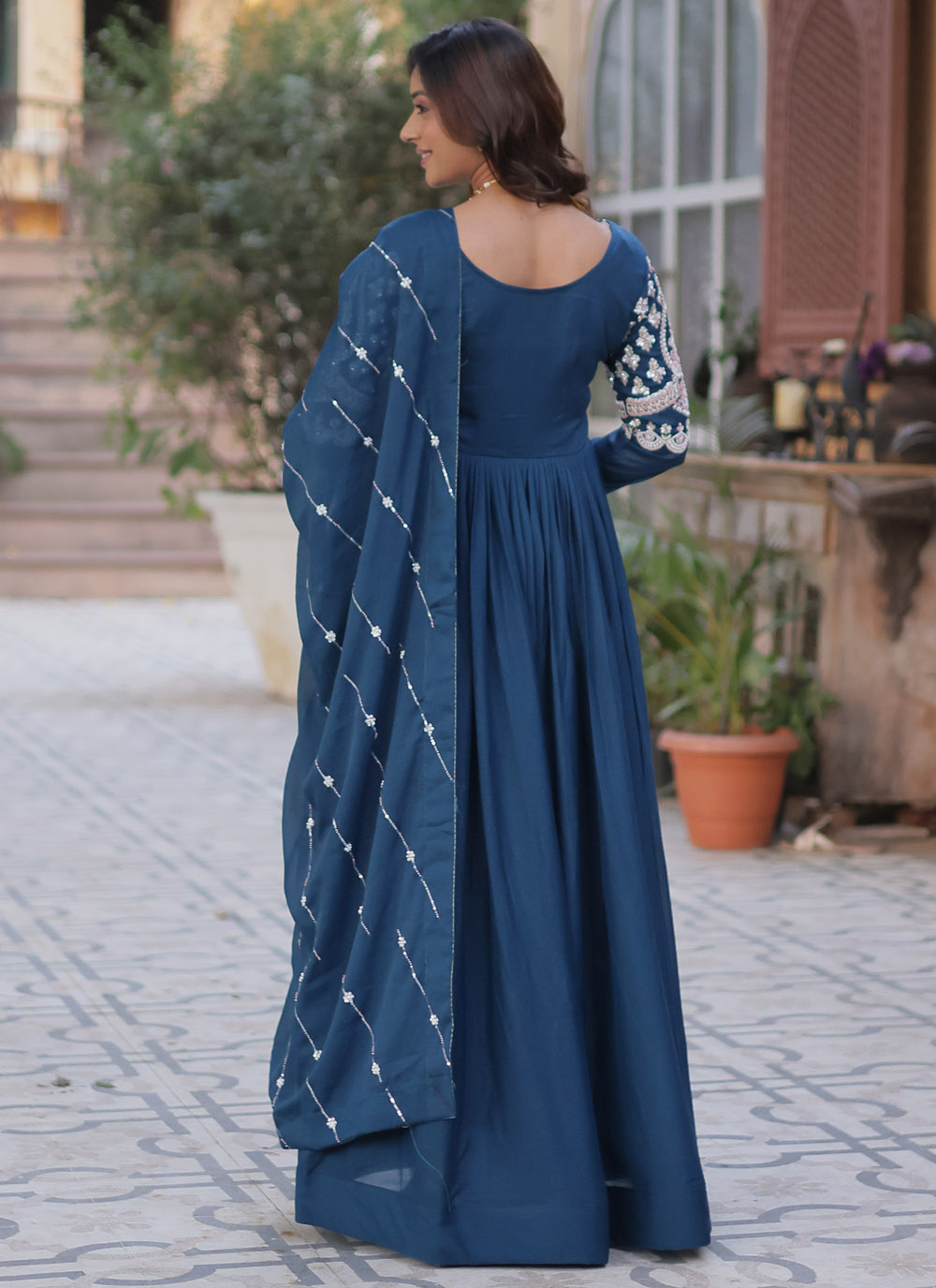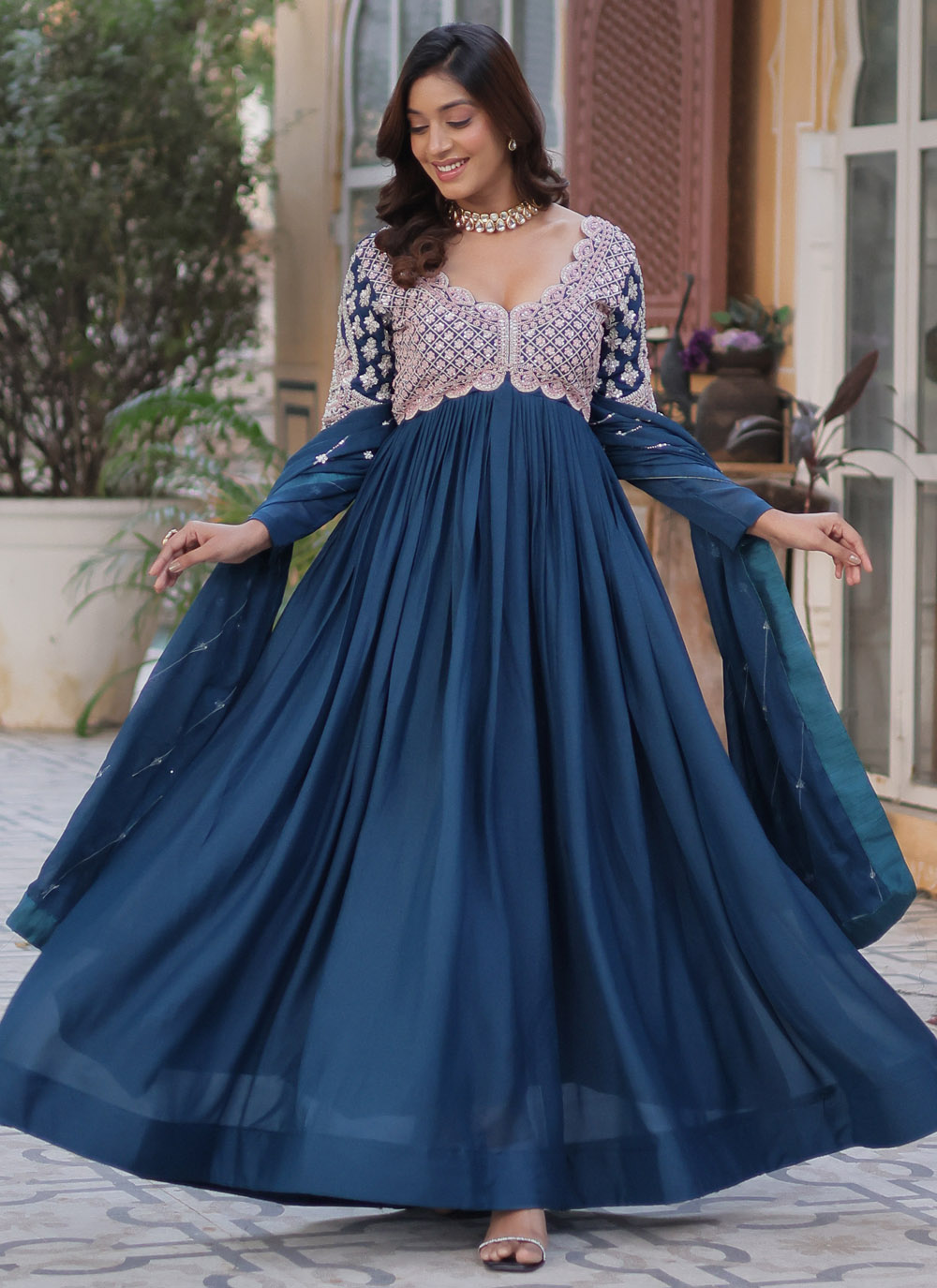 This Trendy Georgette Gown in a stunning morpeach shade is adorned with glimmering sequins and beads, creating a mesmerizing effect. The flowy silhouette enhances your elegance, making it a perfect choice for cocktail parties, special occasions, and engagement ceremonies. Comes with matching dupatta.