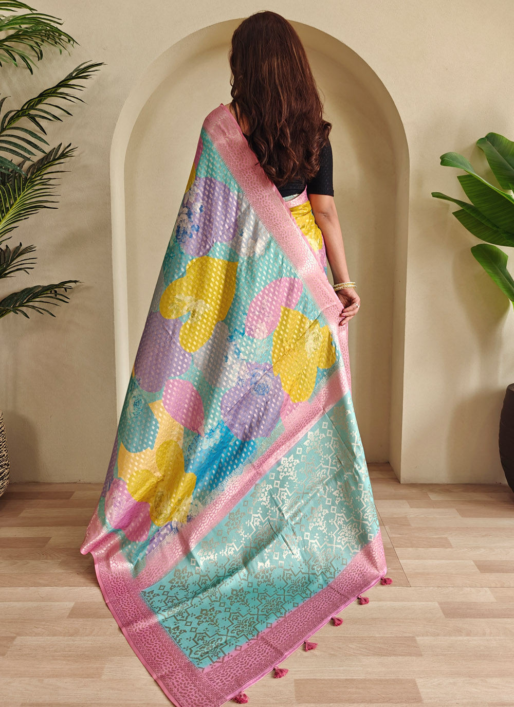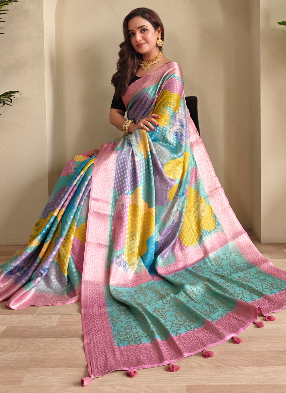 Graceful and light, this Multi Colour Georgette Saree boasts delicate weaving and artistic print work. Its soft texture and flowing silhouette make it an ideal pick for ceremonial and festive gatherings. Comes with matching blouse.