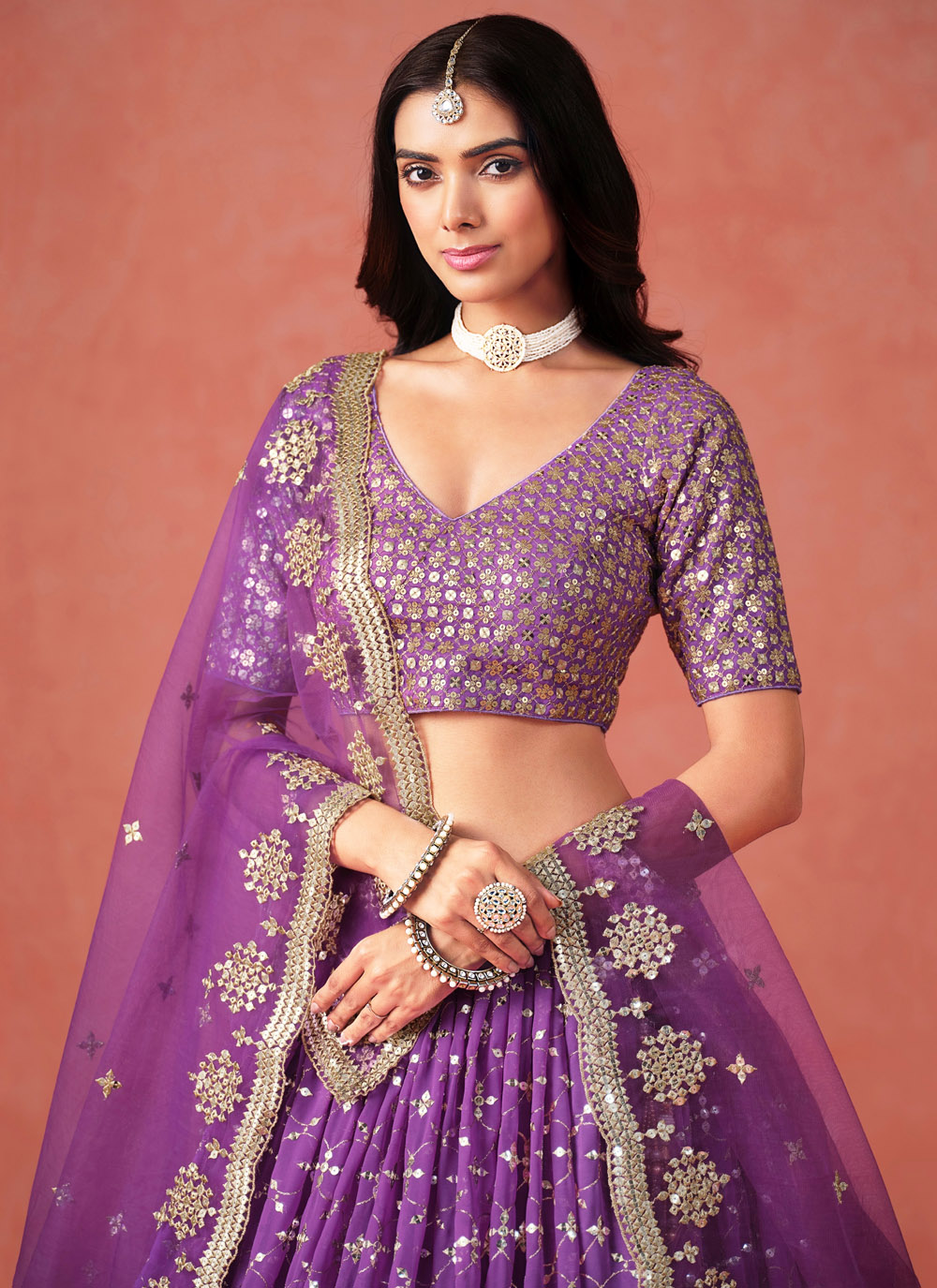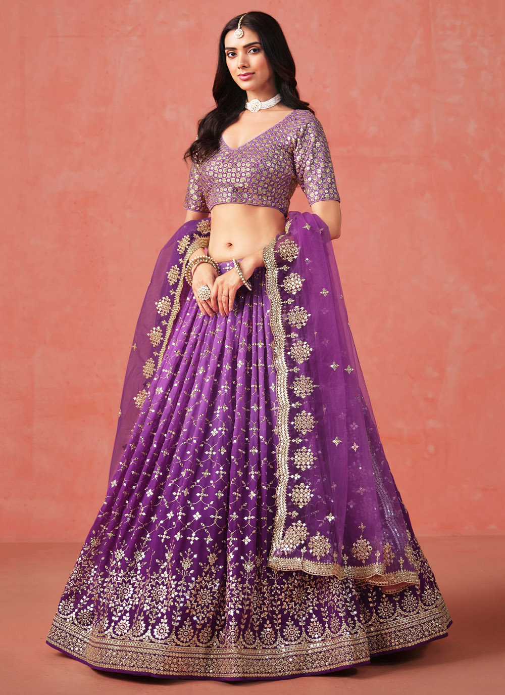 This reception-ready lehenga choli in deep purple is a blend of luxurious georgette fabric, intricate zari work, and sparkling sequins. Designed to offer elegance and style, it's perfect for brides, bridesmaids or anyone attending a royal celebration. Comes with matching choli and dupatta.