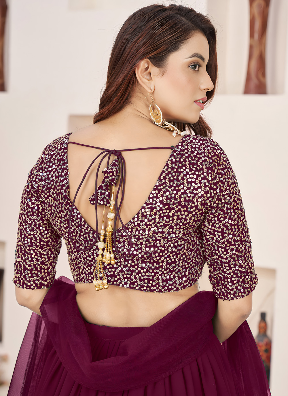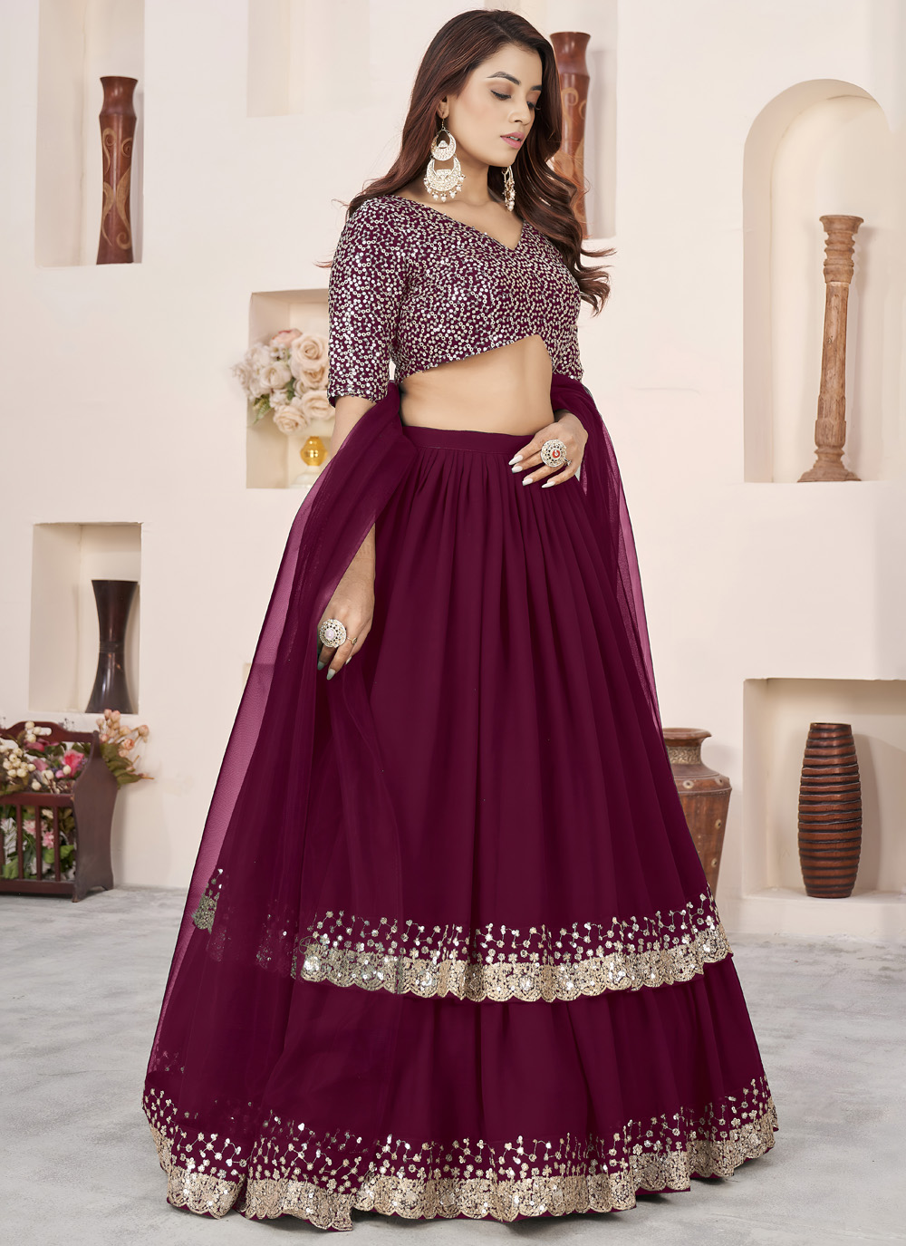 This elegant purple lehenga choli blends traditional craftsmanship with contemporary design. The sequins zari embroidery on soft georgette fabric makes it a beautiful choice for weddings and ceremonial functions. Comes with matching choli and dupatta.