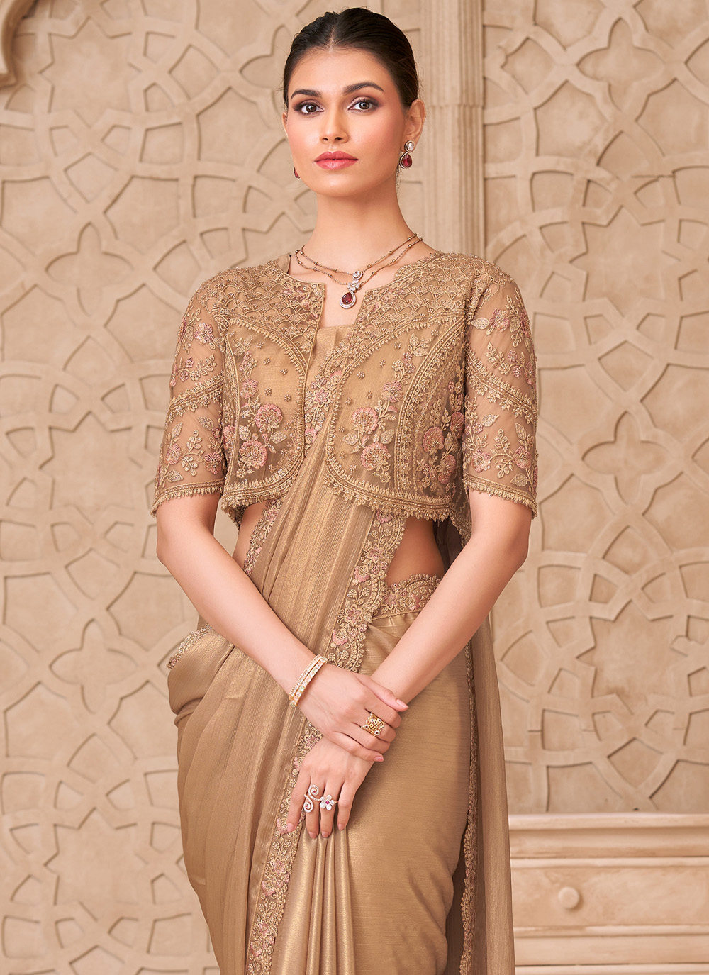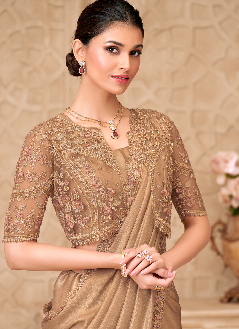 This beige border work saree reflects refined artistry and sophistication. The subtle beige tone and intricate border embroidery bring out a royal charm, ideal for cultural functions, weddings and festive wear. Comes with matching blouse.