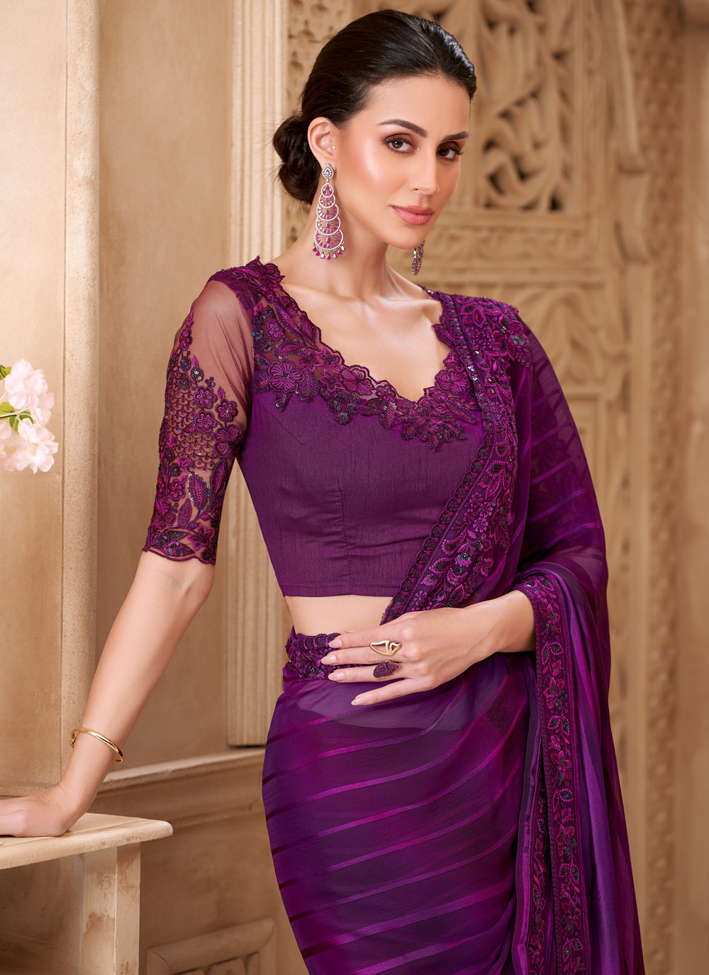 This border embroidered georgette satin saree blends traditional artistry with a trendy color palette. The subtle embroidery and smooth finish make it a stunning choice for receptions and festive occasions. Comes with matching blouse.