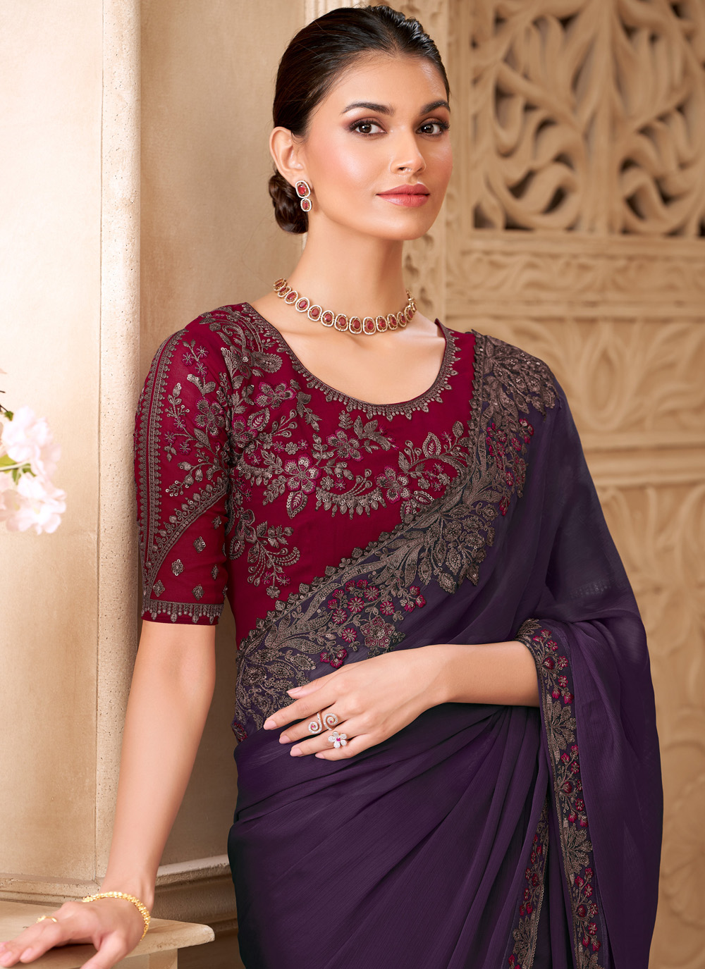 Add depth and elegance to your festive attire with this georgette satin saree in a stunning wine tone. The beautifully embroidered border creates a striking contrast, enhancing the saree’s visual appeal. Comes with matching blouse.