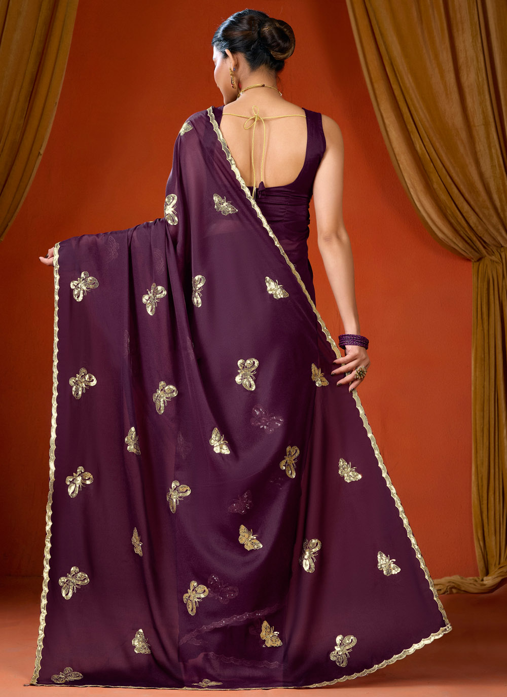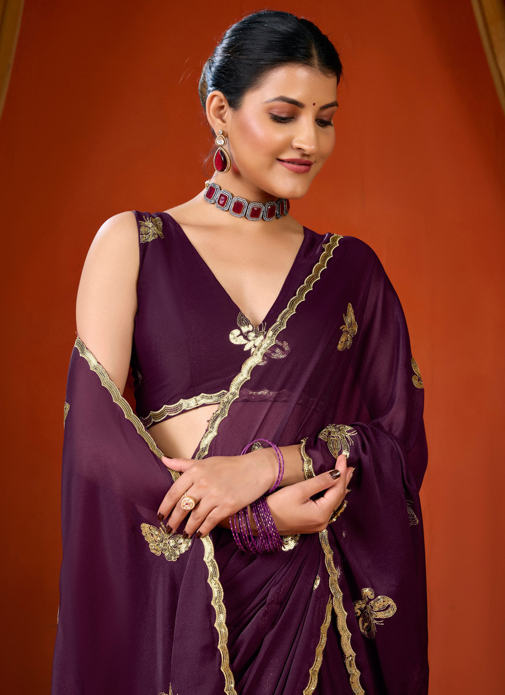 Add a royal touch to your ethnic collection with this Classic Purple Georgette Saree. The lightweight georgette fabric ensures comfort, while the elegant sequins embroidery enhances its sophisticated look. Comes with matching blouse.