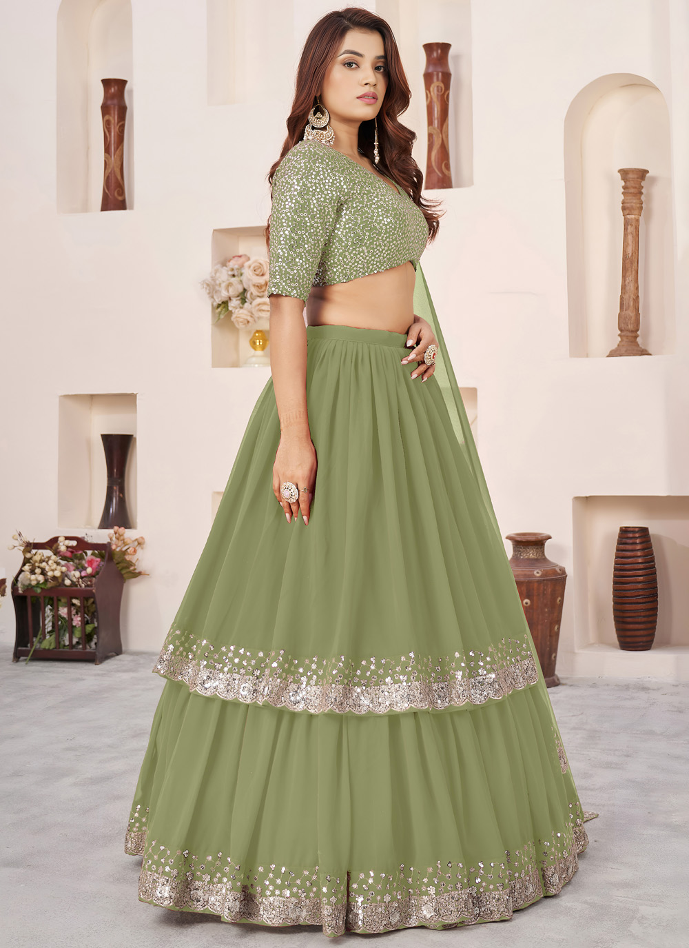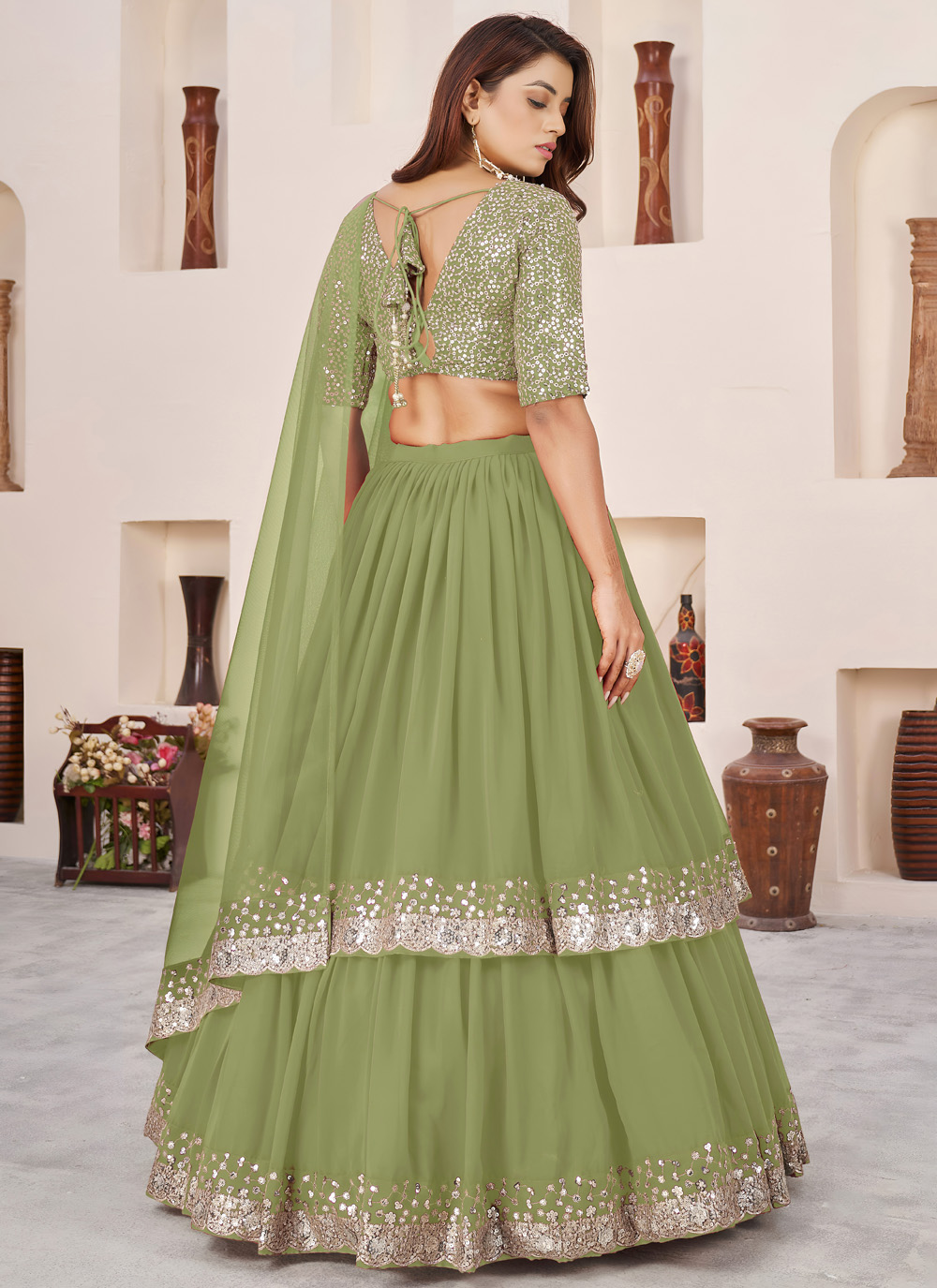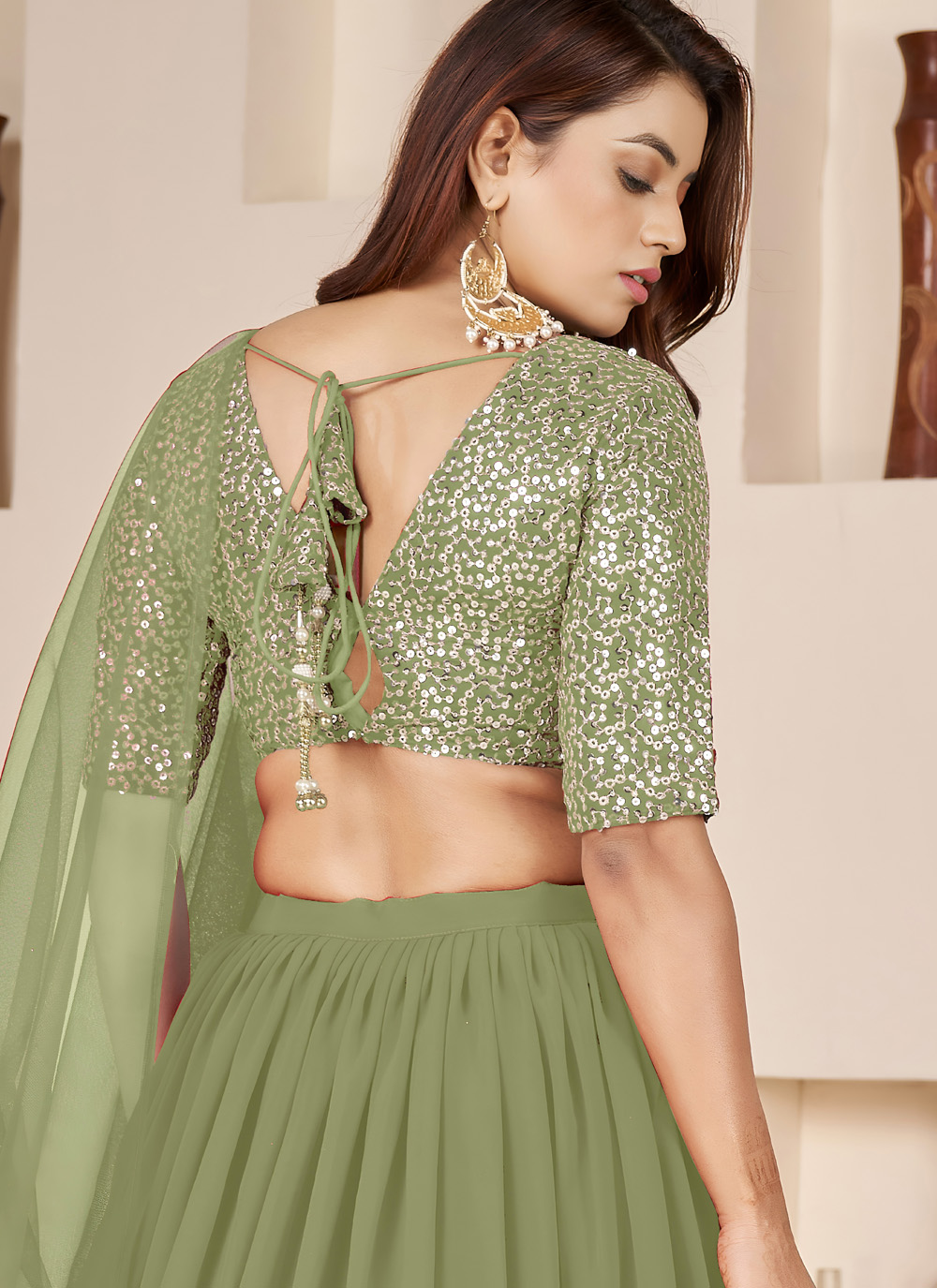 This green designer lehenga choli is crafted in soft georgette fabric and enhanced with detailed sequins and zari embroidery. Its elegant design and graceful flow make it perfect for weddings and festive celebrations. Comes with matching choli and dupatta.