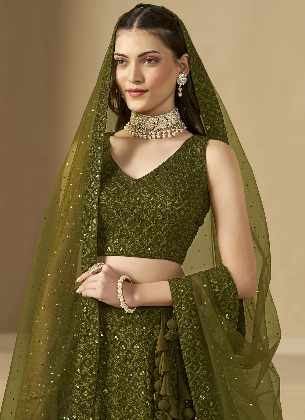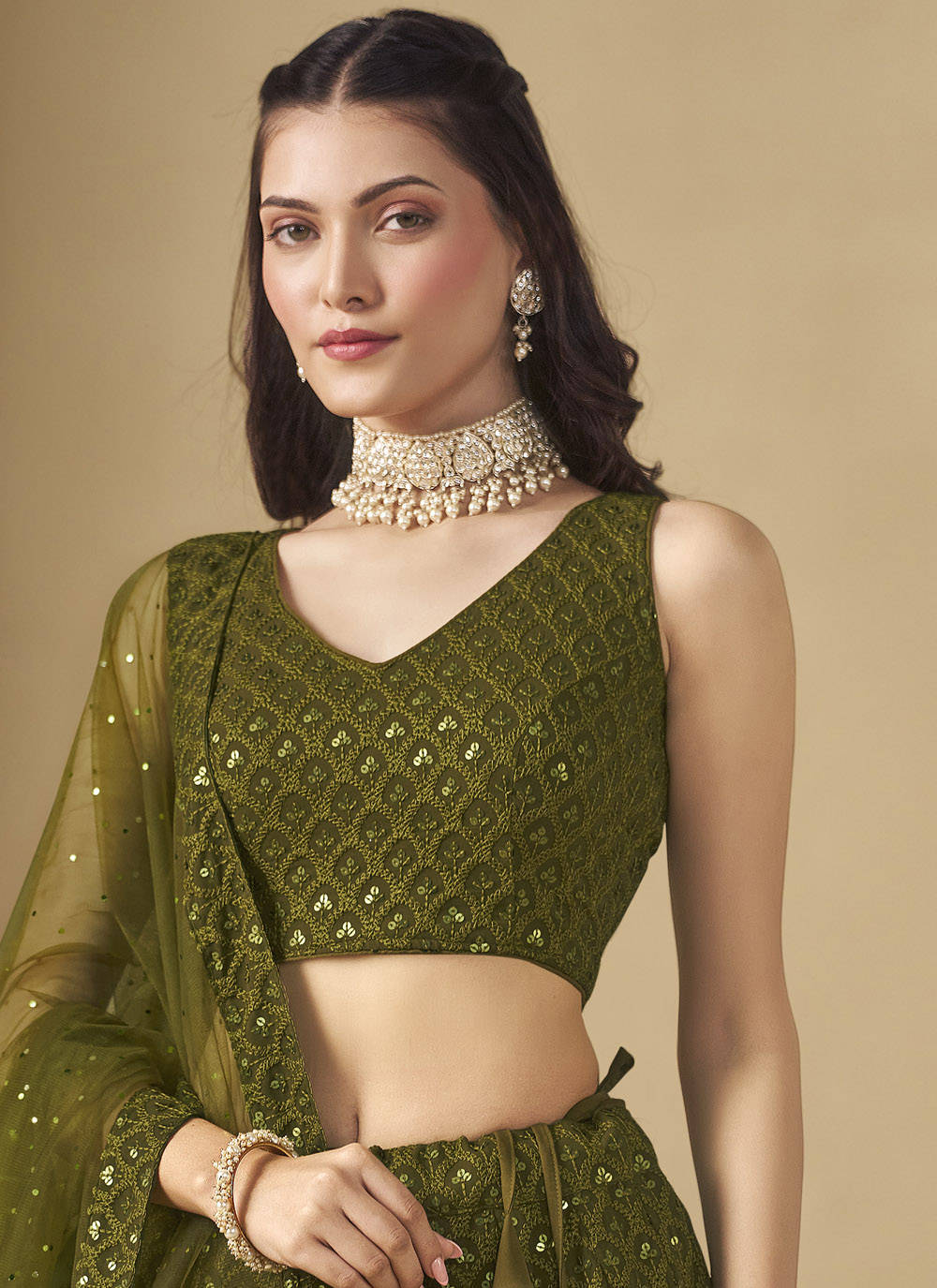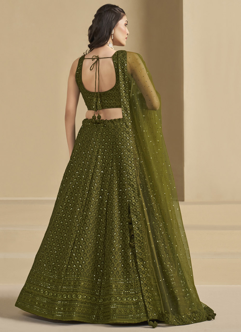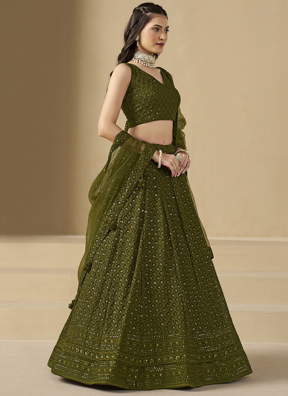 This Georgette Lehenga Choli in bright green is designed to elevate your mehndi look. Featuring intricate sequins embroidery, it offers the perfect blend of traditional charm and modern sparkle. Ideal for bridesmaids and wedding guests, this outfit ensures you shine through every celebration. Comes with matching choli and dupatta.