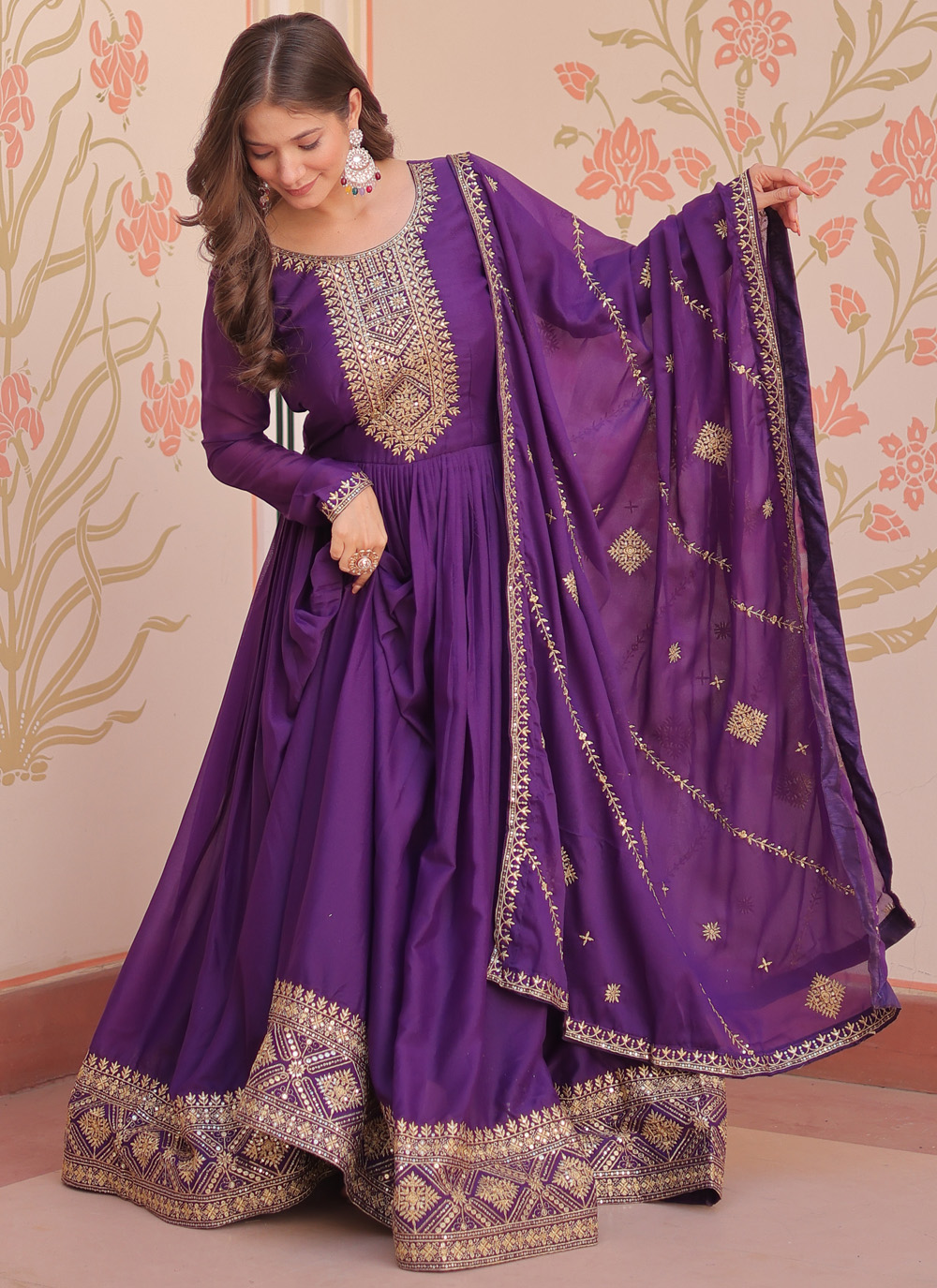 Designed in soft georgette, this ready-to-wear gown ensures a flattering drape that moves with grace. The zari detailing paired with sequin highlights adds a festive sparkle while keeping the look sophisticated. Comes with matching dupatta.