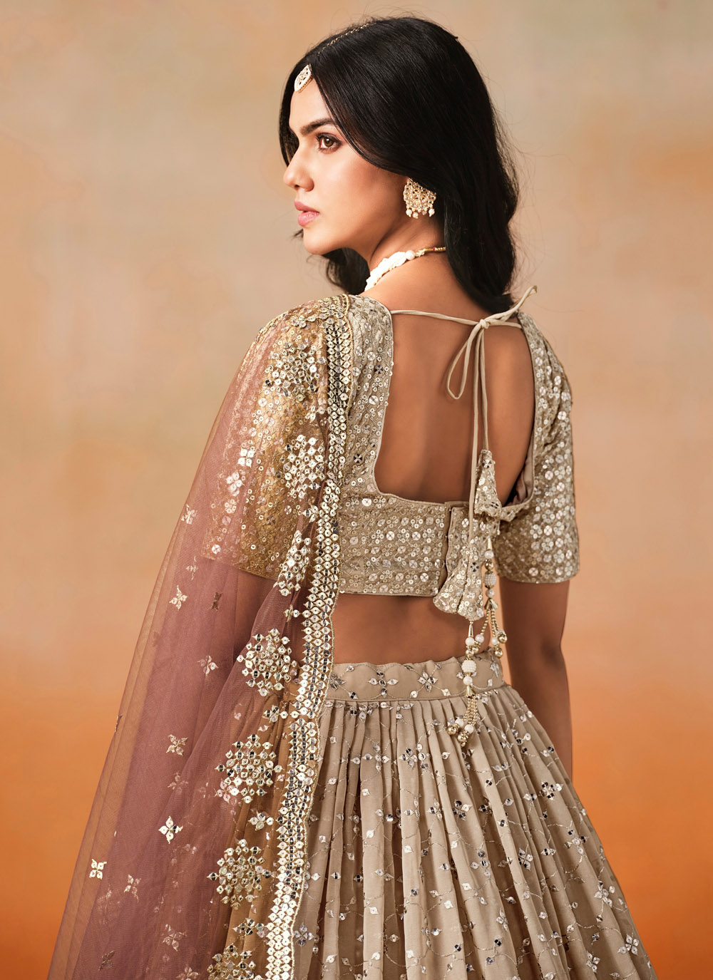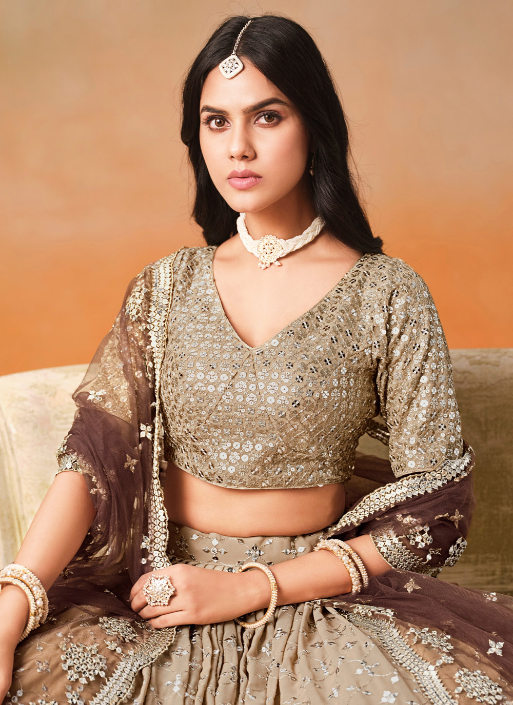This stylish brown lehenga choli in soft georgette is beautifully enhanced with shimmering sequins and zari embroidery. Perfect for festive functions, weddings and evening parties, it blends ethnic charm with modern day glamour. Comes with matching choli and dupatta.