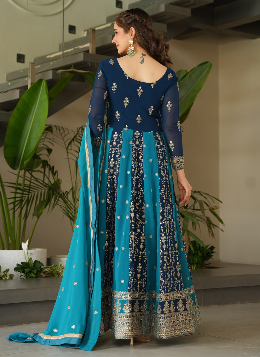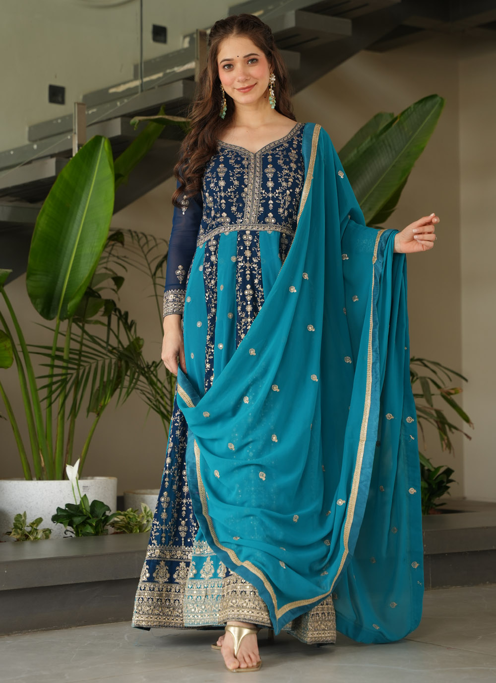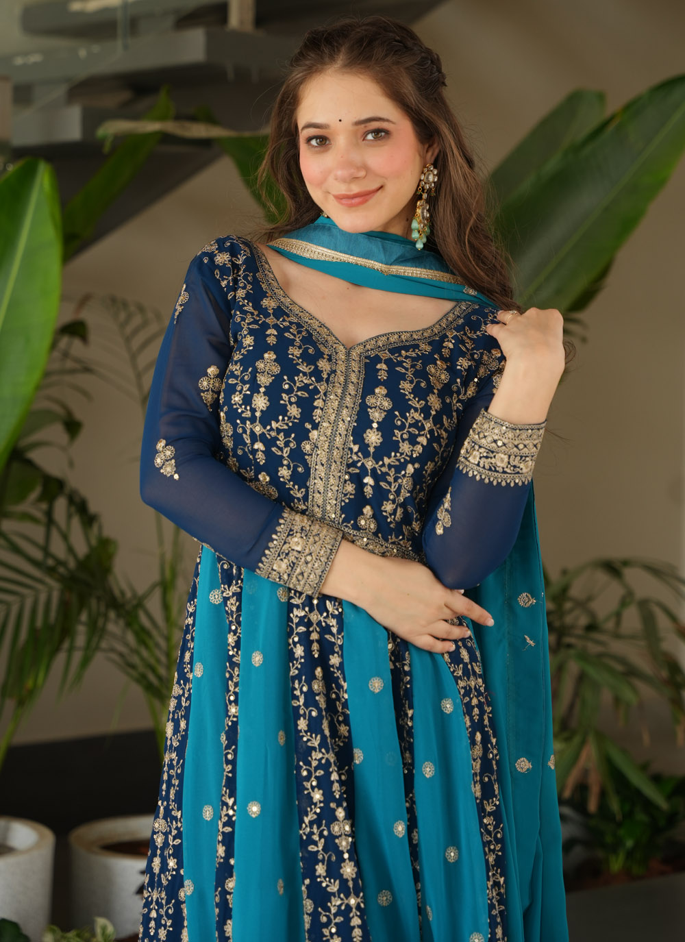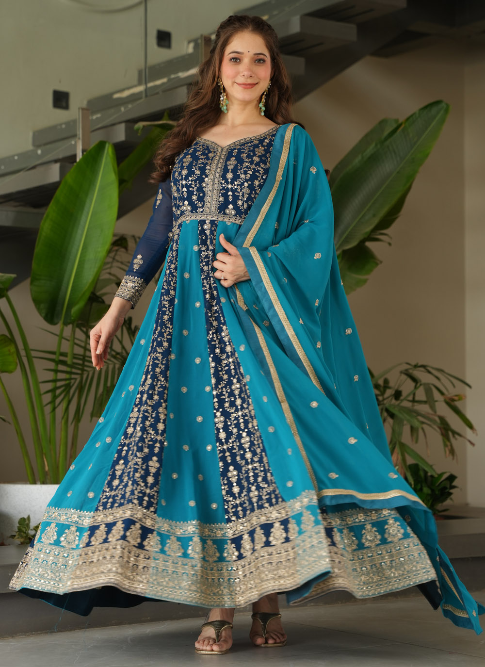 This trendy embroidered gown in Rama shade is a masterpiece of design, featuring elegant zari patterns and sequins embellishments on soft georgette. perfect for festive gatherings and evening events. Comes with matching dupatta.