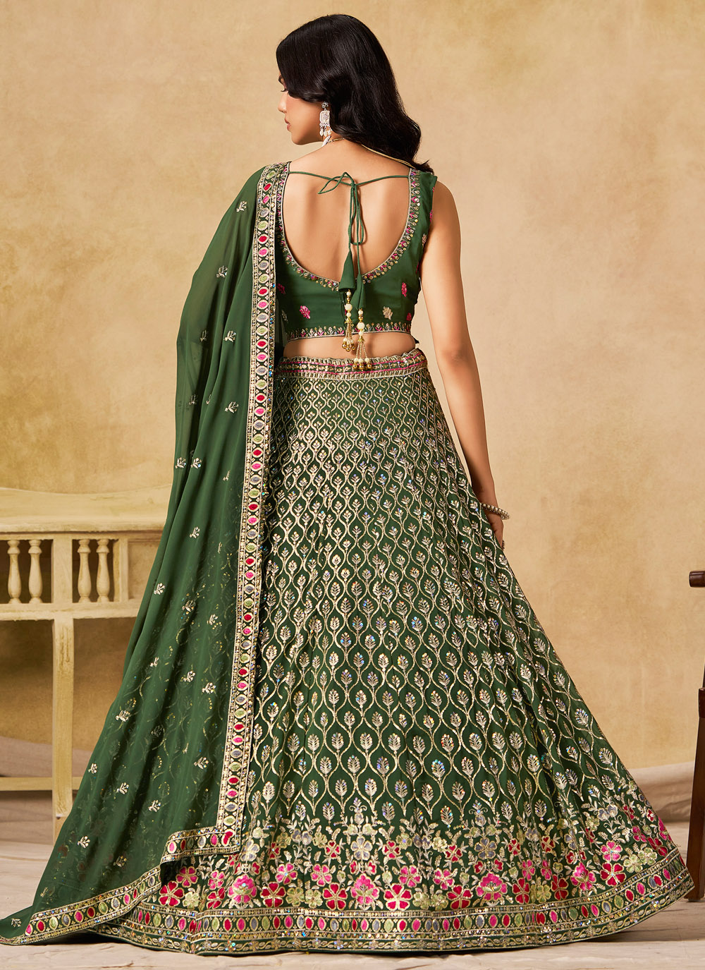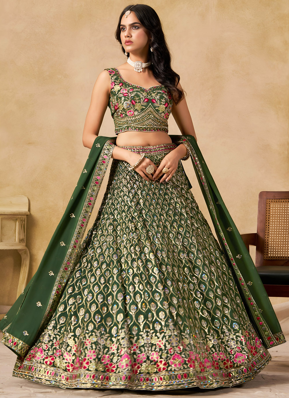 This embroidered green wedding lehenga choli is designed for women who love a blend of rich craftsmanship and modern sophistication. Intricate thread patterns highlight the entire ensemble, complemented by shimmering sequins that sparkle with every move. Comes with matching choli and dupatta.
