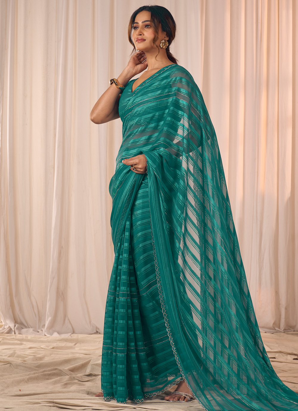 This teal georgette saree brings a modern festive charm with its shimmering zarkan border and delicate cutwork touches. The refreshing teal shade adds a contemporary twist to classic ethnic wear, making it perfect. Comes with matching blouse.
