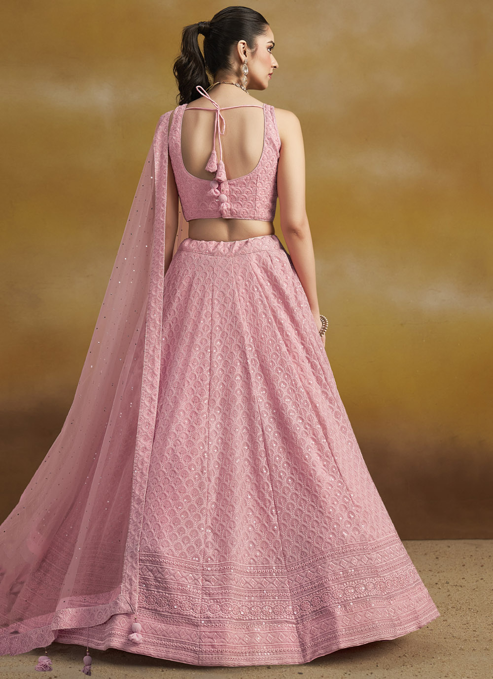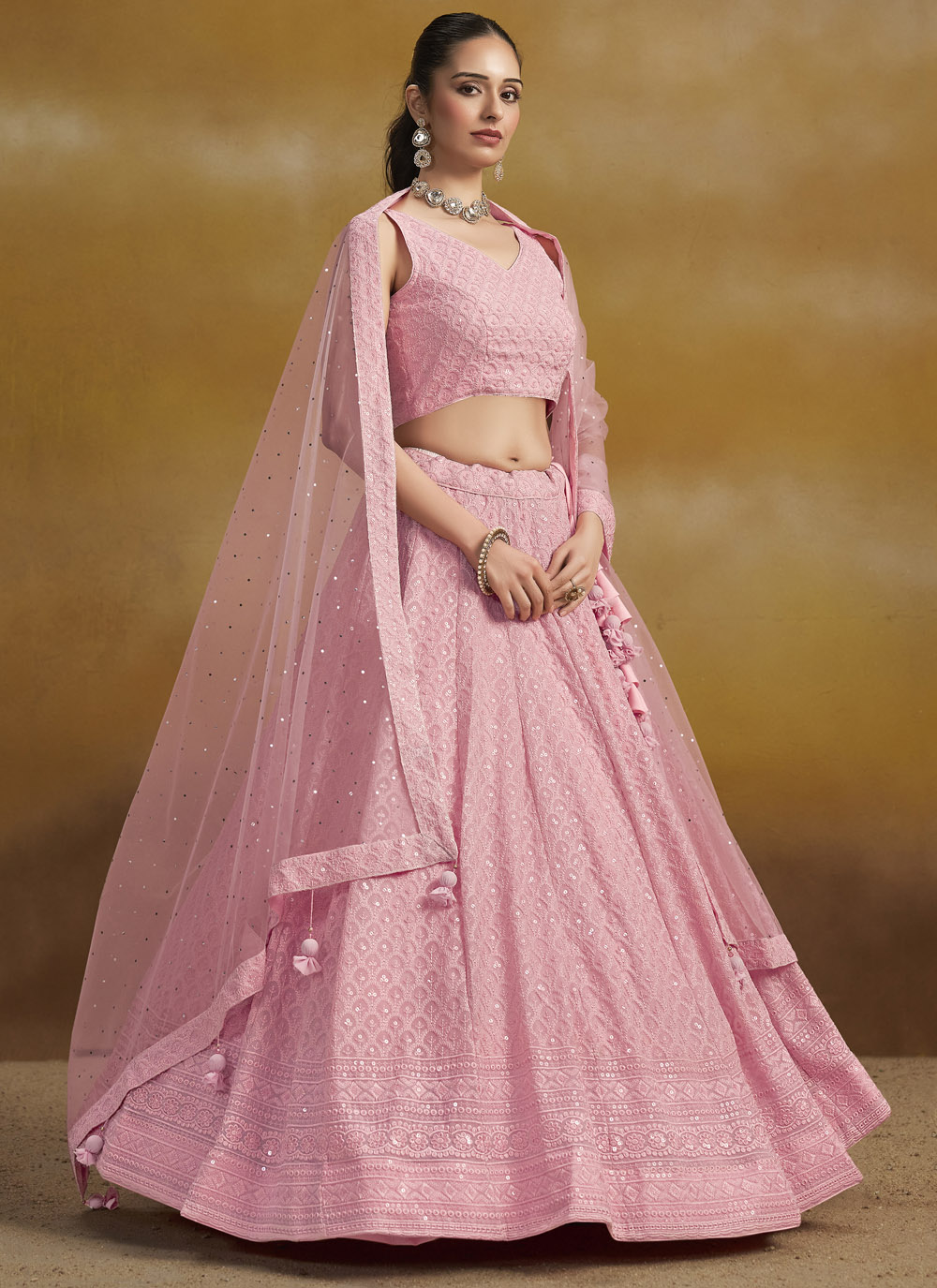 This Pink Georgette Lehenga Choli is a harmonious blend of traditional thread embroidery and glistening sequins work, making it a dreamy choice for contemporary bridesmaids and wedding attendees. The lightweight feel ensures elegance with comfort. Comes with matching choli and dupatta.