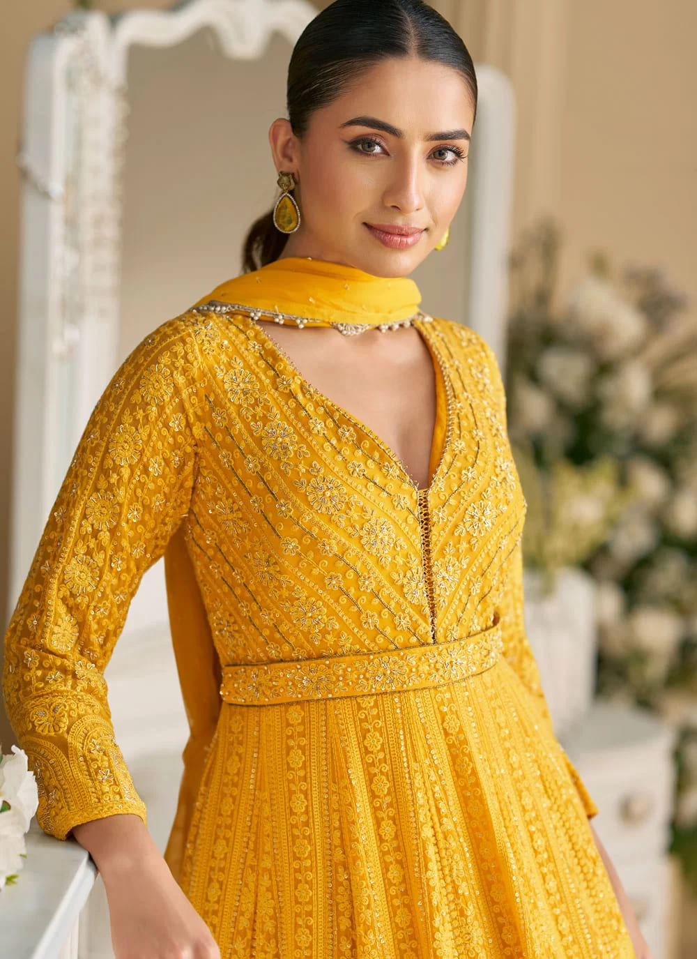 This yellow georgette readymade gown is beautifully adorned with delicate chikankari and refined embroidery work. The soft flow of georgette combined with its bright hue makes it a perfect choice for ceremonial functions and festive moments. Comes with matching dupatta.