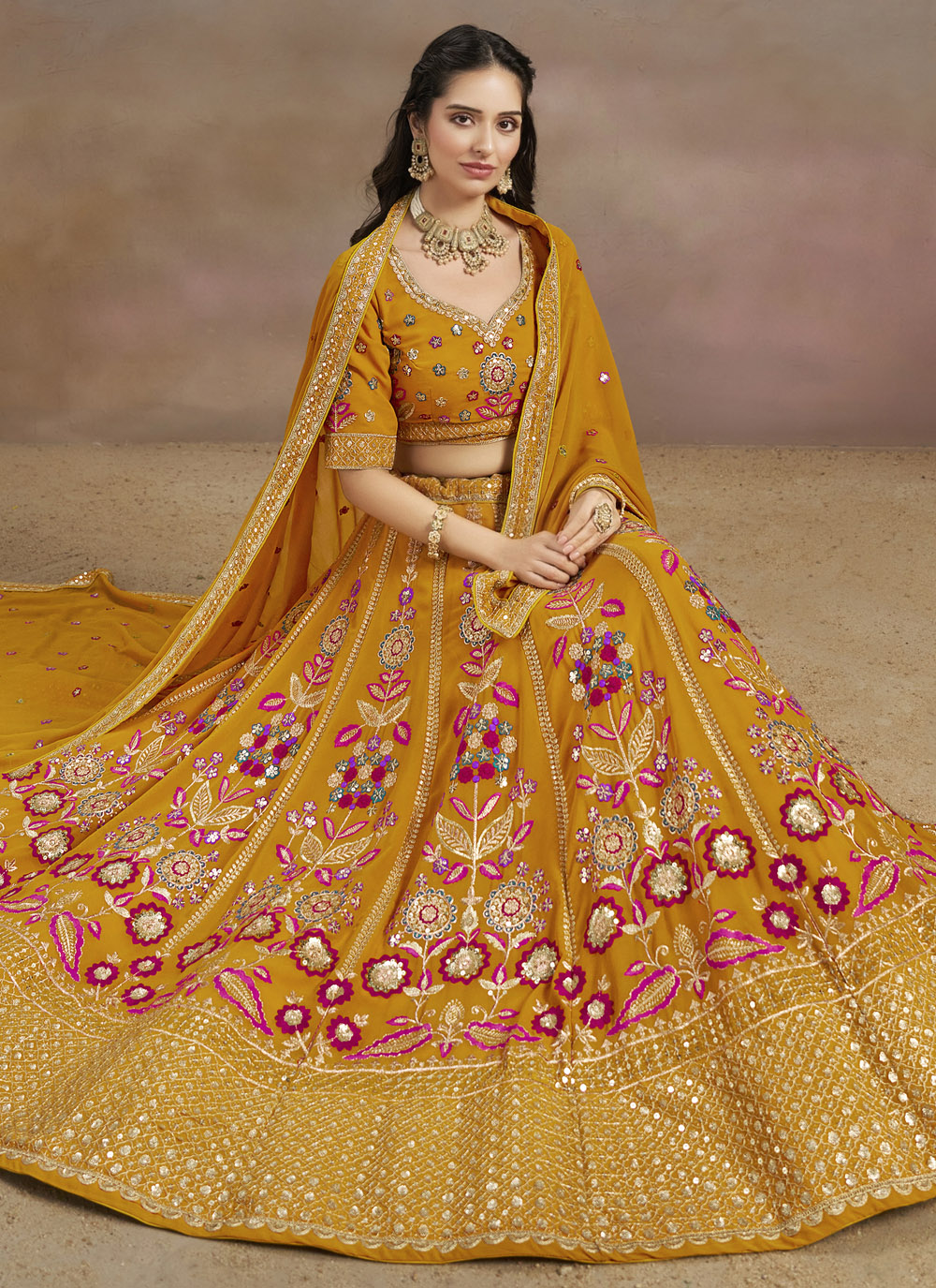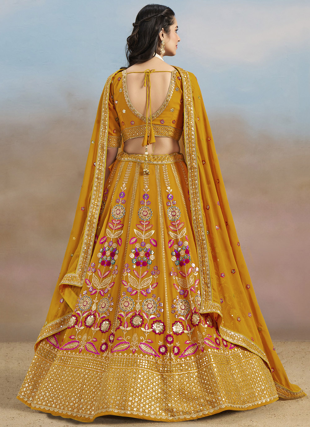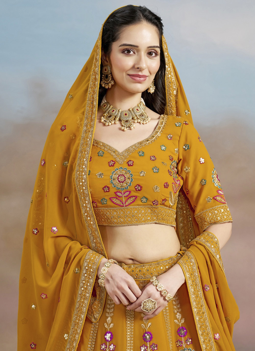This yellow A-line lehenga choli in breezy georgette features traditional dori embroidery paired with colorful threadwork, offering a radiant look for daytime festivities. Perfect for haldi or pre-wedding events, it’s a beautiful blend of comfort and celebration-ready style. Comes with matching choli and dupatta.