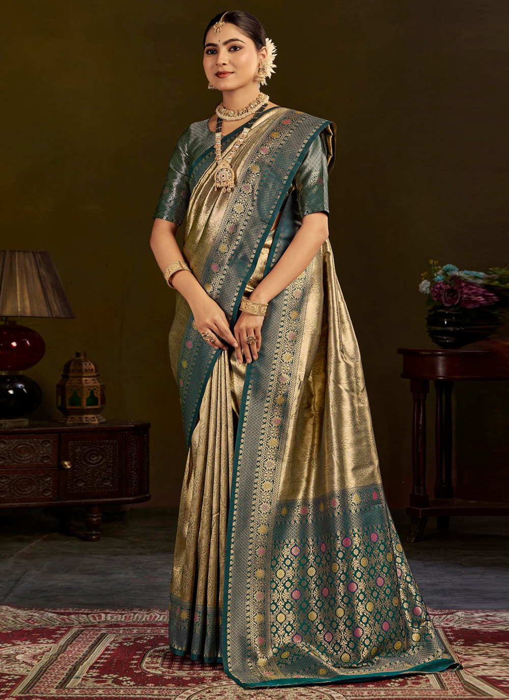 Celebrate in style with this gold zari work Banarasi silk saree. The premium silk fabric flows gracefully, while the intricate weaving showcases skilled detailing that elevates your ethnic look for grand ceremonies. Comes with matching blouse.