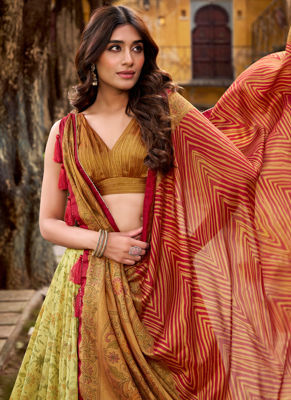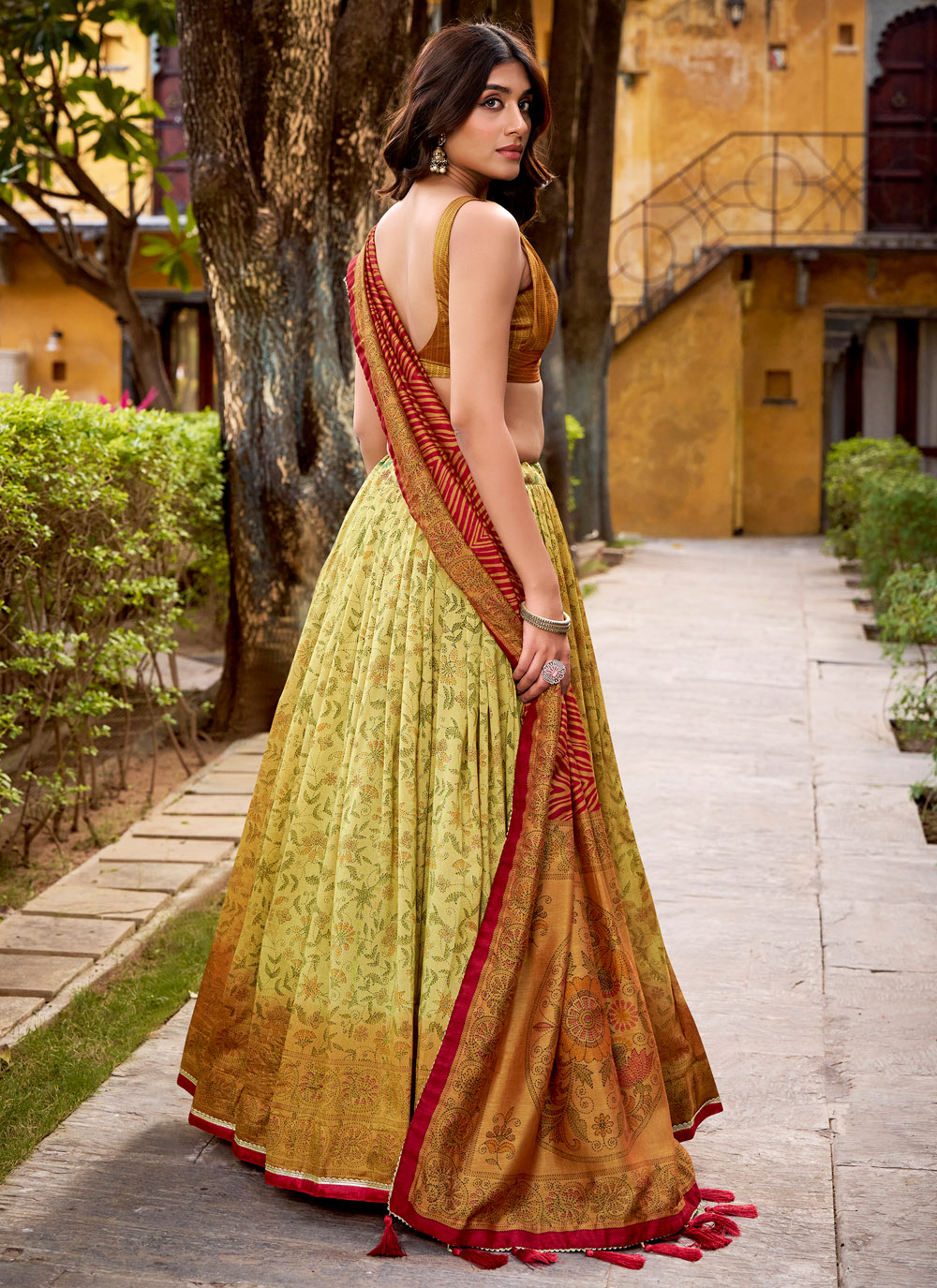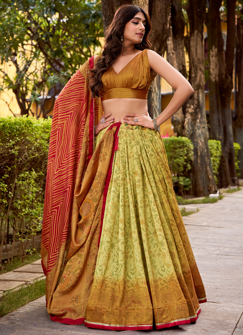 Designed with a traditional yet trendy touch, this printed vichitra silk lehenga choli showcases green and brown tones that create a warm festive appeal. Its soft texture ensures comfort with stylish elegance. Comes with matching choli and dupatta.