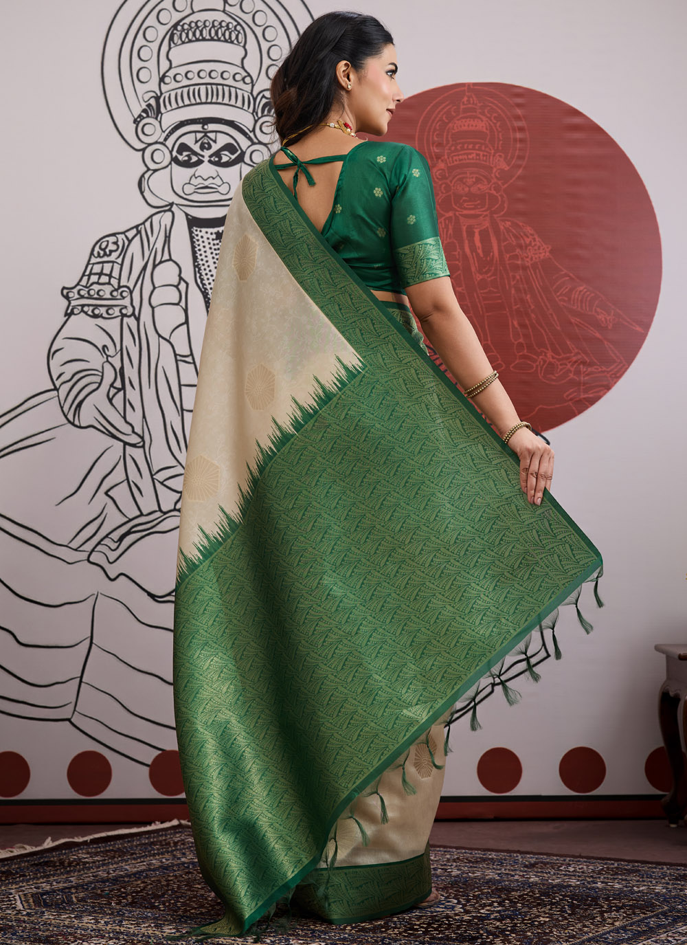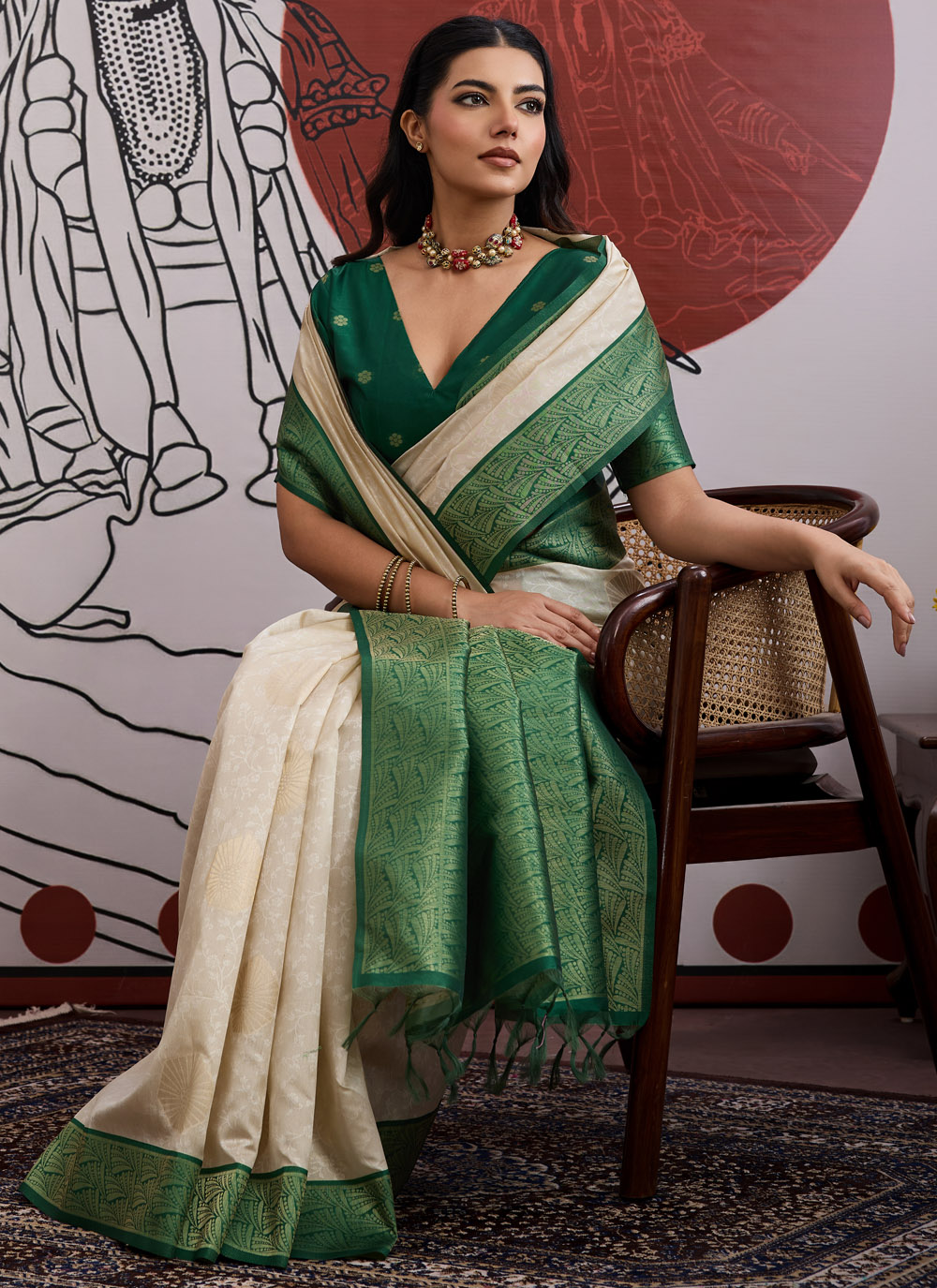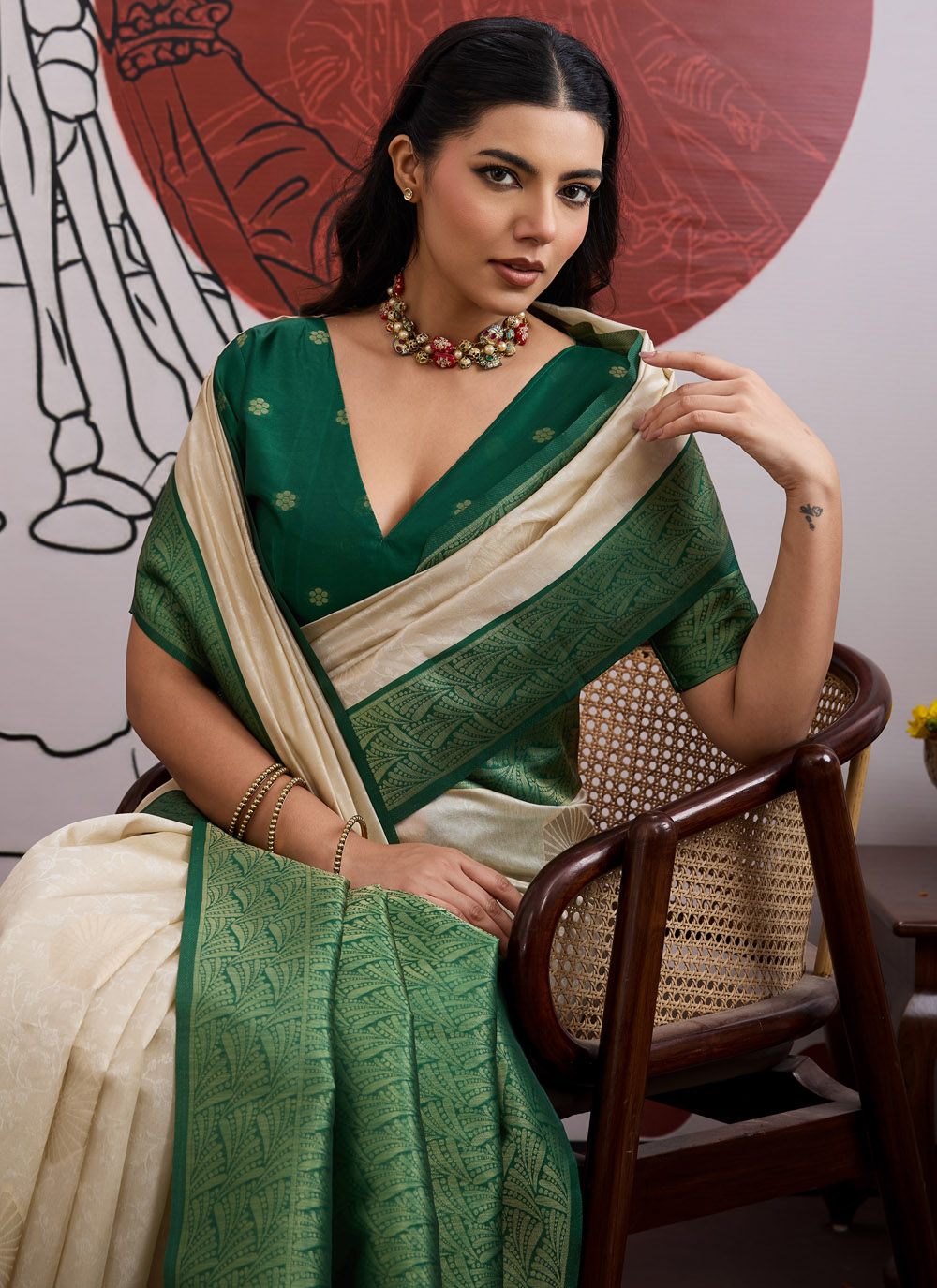 This green and cream handloom silk saree features intricate zari weaving that reflects timeless craftsmanship. The elegant color combination adds a classic and graceful charm suitable for traditional occasions. Comes with matching blouse.