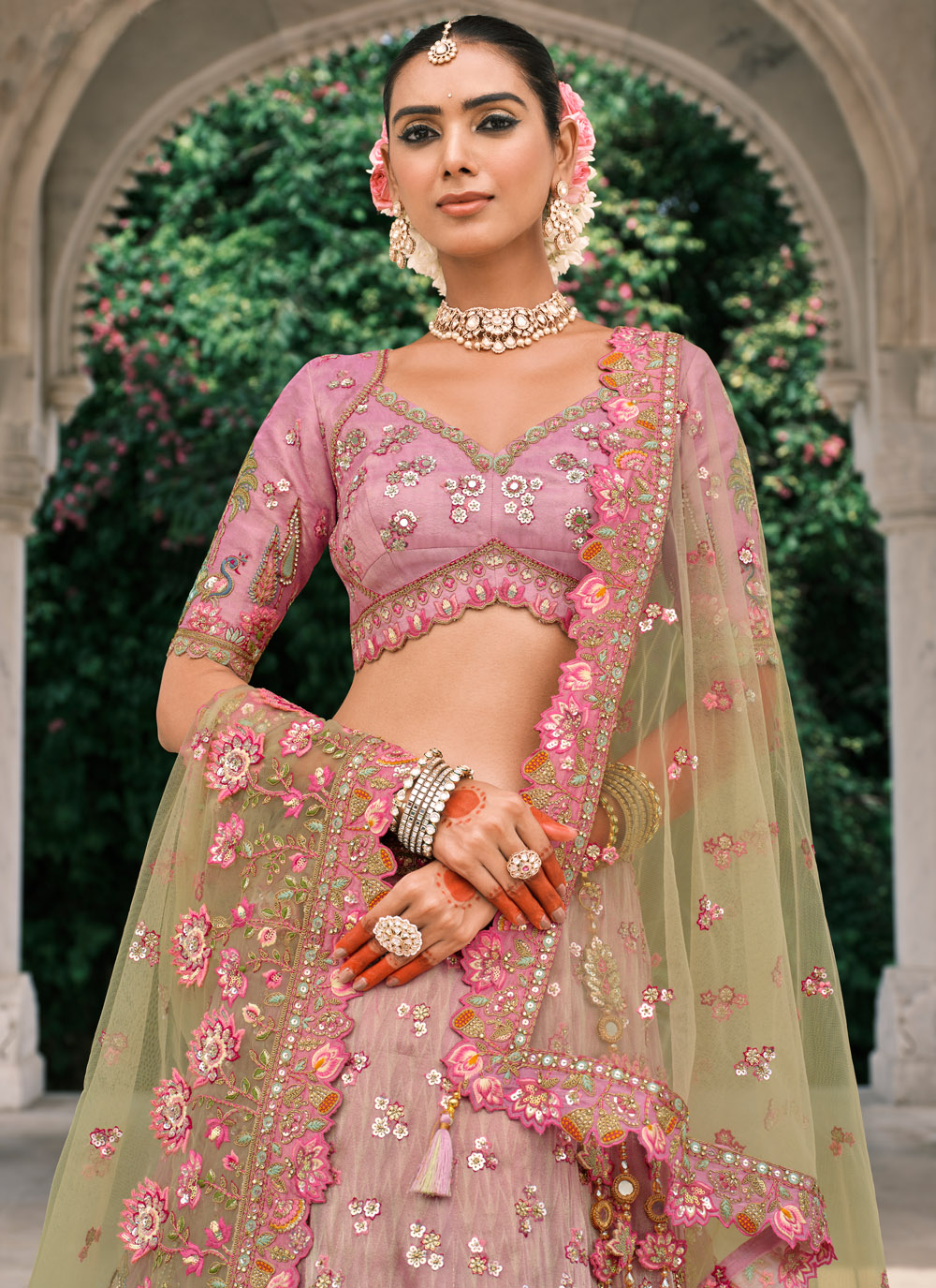 Celebrate tradition with a modern twist in this silk lehenga choli in green and pink. The combination of shimmering sequins, dazzling mirrors, and stones creates a glamorous look, while the detailed cutwork border highlights its regal charm. Comes with matching choli and dupatta.