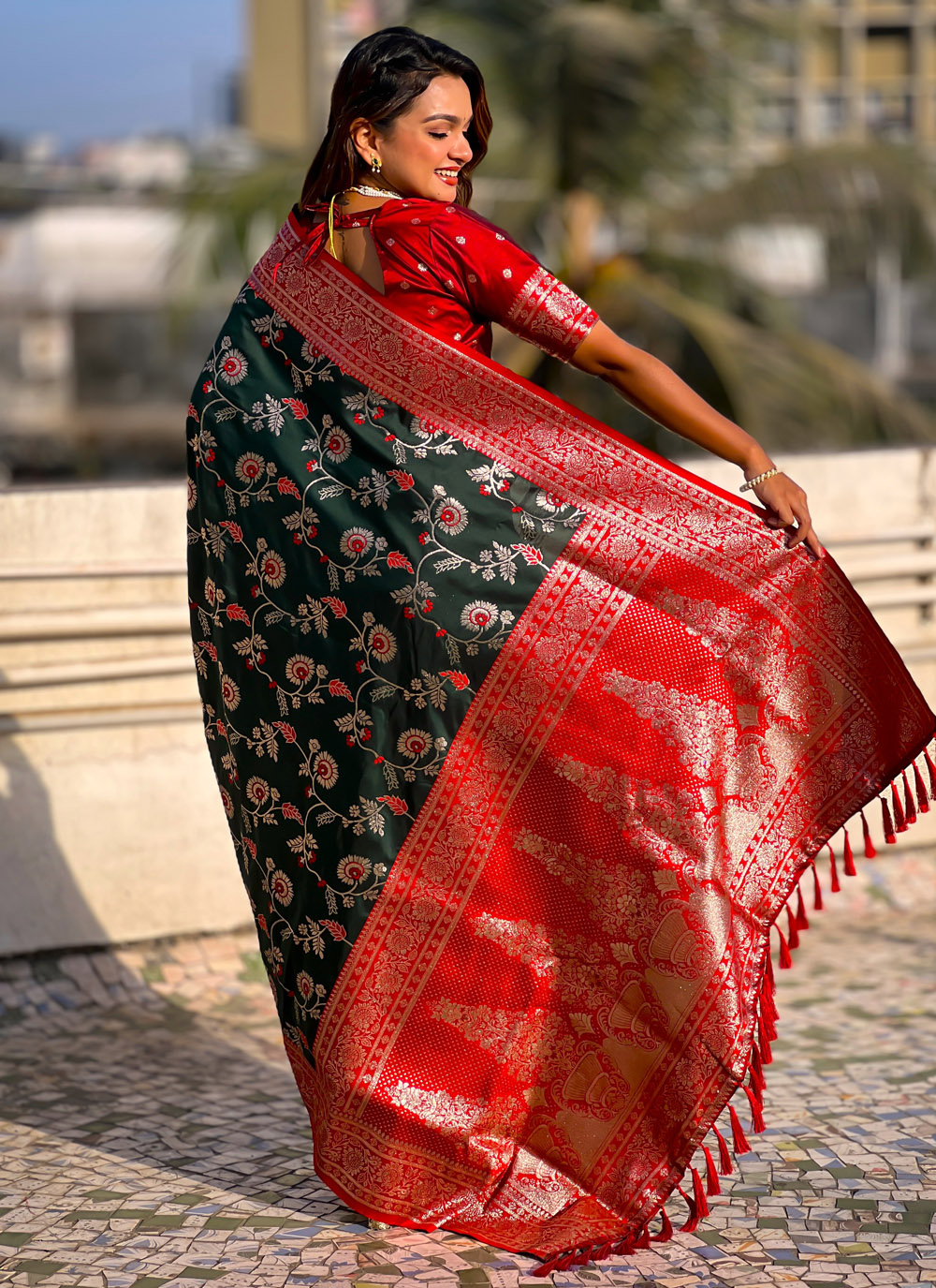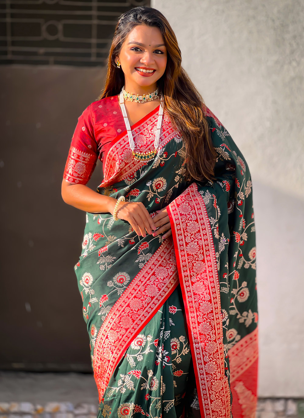 Step into elegance with this stunning Green Banarasi Silk Saree, crafted with intricate Meenakari artistry and woven Zari patterns. The perfect addition to your ethnic collection for weddings, engagements, and celebrations. Comes with matching blouse.