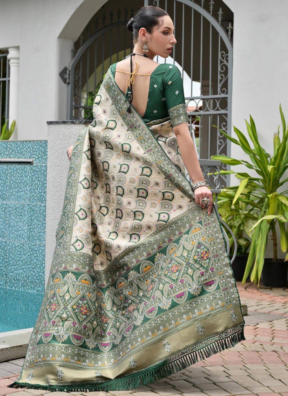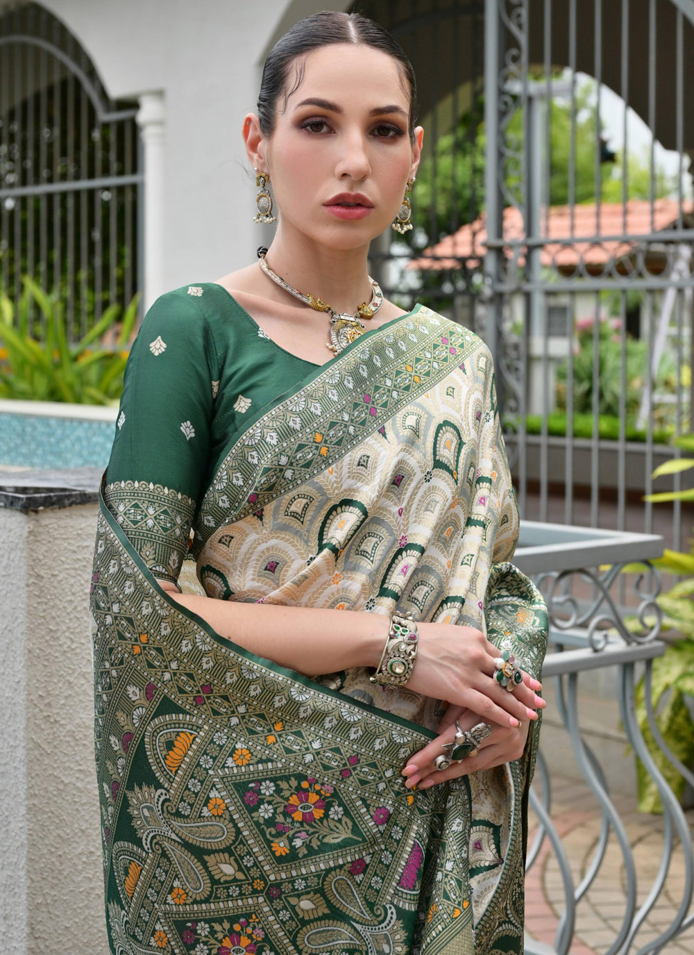 This green Banarasi silk saree is a true representation of traditional craftsmanship and royal beauty. The exquisite Meenakari zari work creates delicate patterns that enhance its visual richness. Comes with matching blouse.