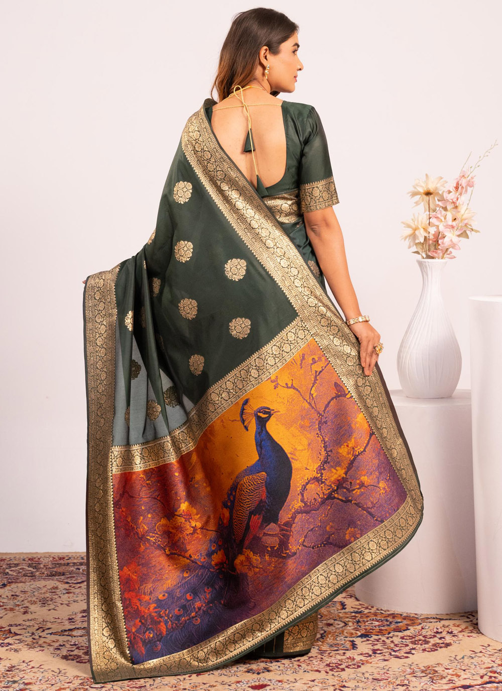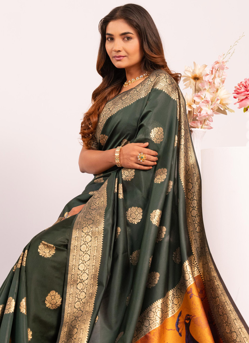 Elevate your ethnic wardrobe with this green Banarasi silk saree designed with fine resham and zari weaving. The vibrant green hue combined with traditional weaving patterns delivers a sophisticated and regal look. Comes with matching blouse.