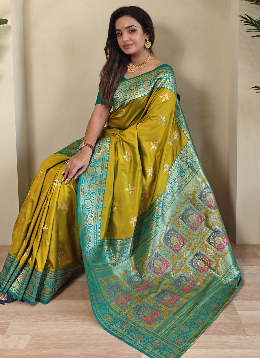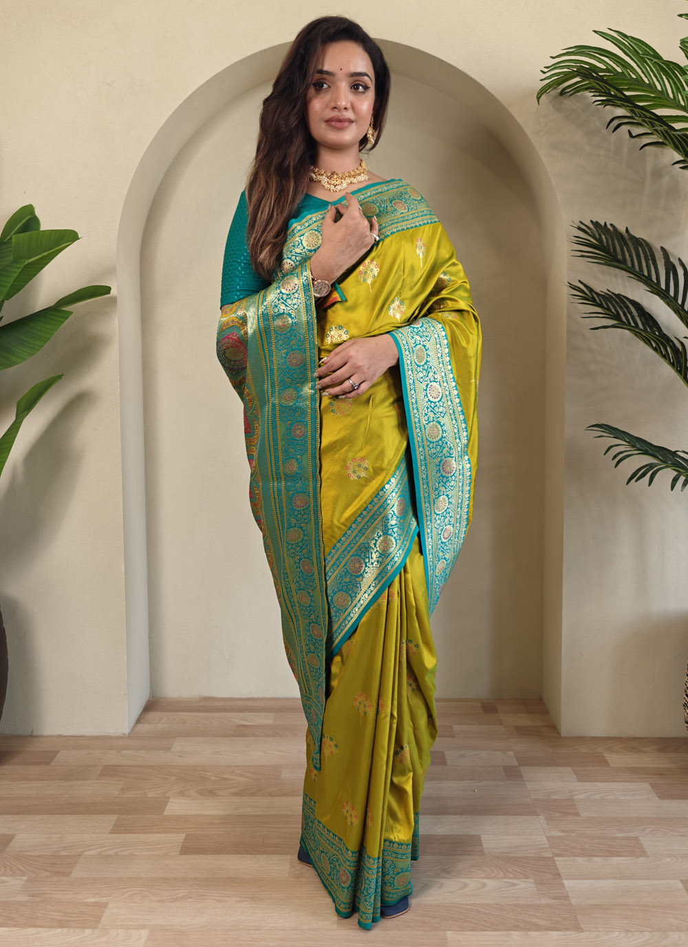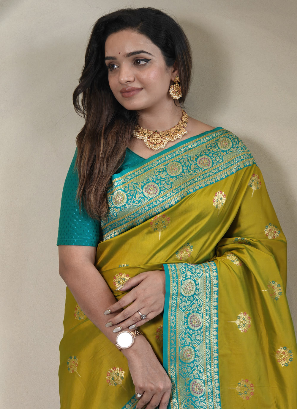 This traditional green Banarasi silk saree blends time-honored weaving techniques with ceremonial charm. The lush green hue adds vibrancy to any festival celebration. Comes with matching blouse.