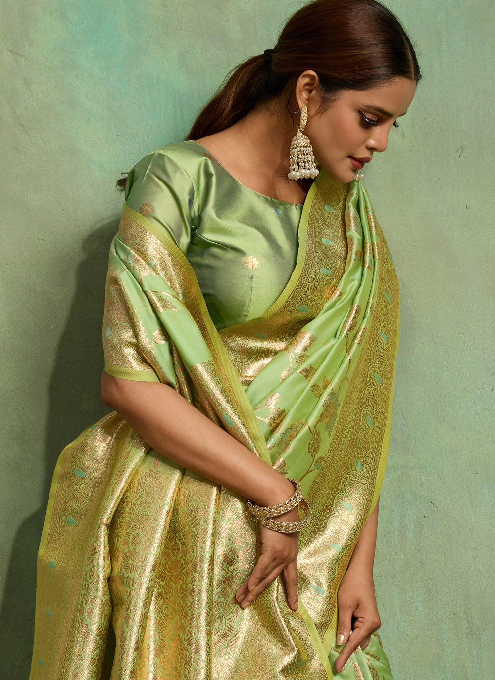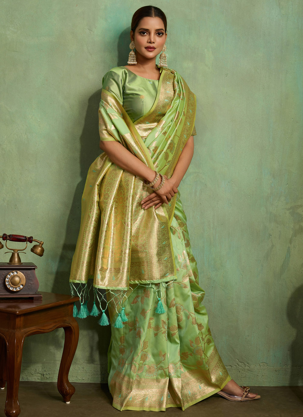 This green Banarasi silk saree beautifully showcases the elegance of zari jaal weaving, enriched with meenakari detailing. Its classic craftsmanship blends cultural heritage with designer finesse. Comes with matching blouse.