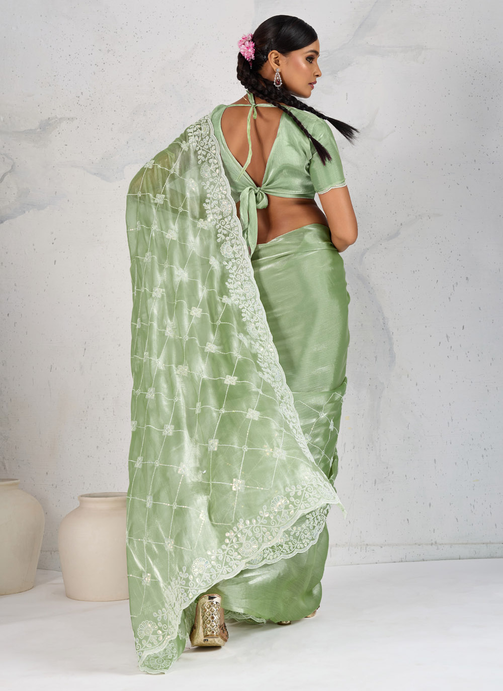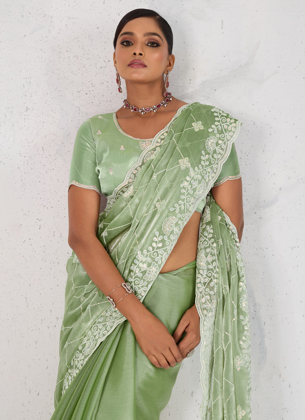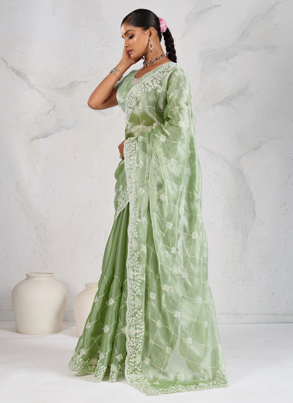 Experience classic elegance in this green Burberry fabric saree, beautifully embellished with fine thread embroidery that adds understated sophistication. The lightweight, fluid fabric drapes effortlessly, creating a polished silhouette suitable for cultural gatherings, festive ceremonies or formal functions. Comes with matching blouse.
