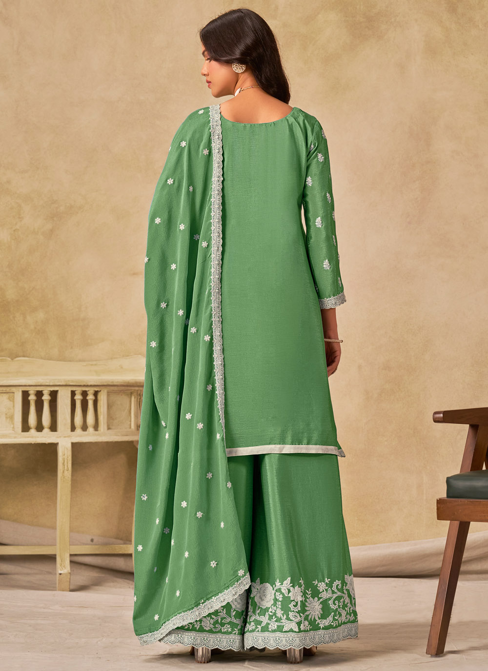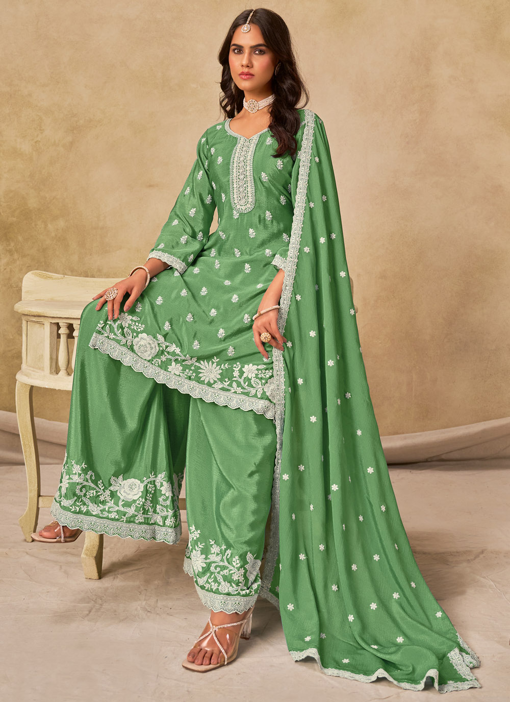 Elevate your festive style with this green chinon embroidered salwar suit, beautifully crafted for ceremonial occasions. The rich hue blends perfectly with delicate thread embroidery, creating a graceful look that is both traditional and elegant. Comes with matching bottom and dupatta.