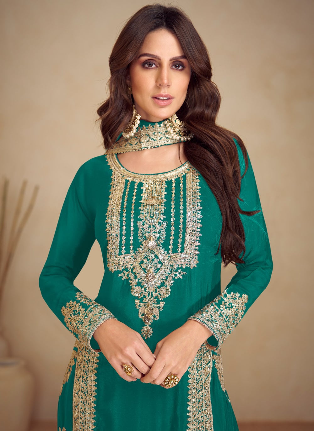 Step out in style with this Green Salwar Kameez, adorned with intricate sequins work. The ceremonial ensemble ensures you look radiant while remaining comfortable throughout the event. Comes with matching bottom and dupatta.