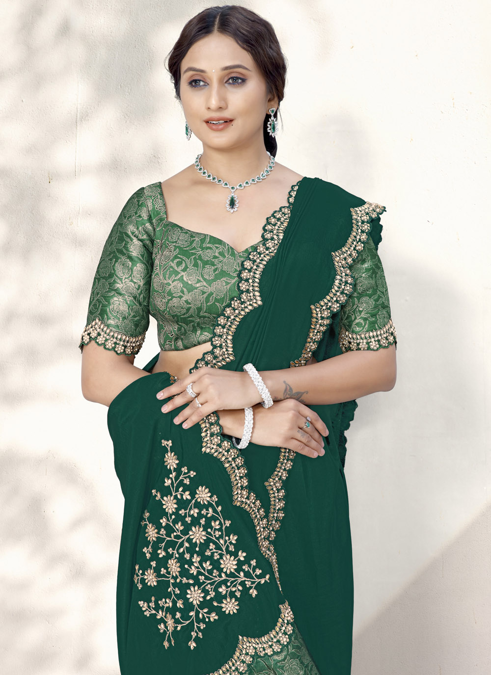Drape yourself in heritage and glamour with this beautiful green saree. The moti and stone work along the borders and pallu enhance its festive look, making it perfect for bridesmaids or family events during wedding season. Comes with matching blouse.
