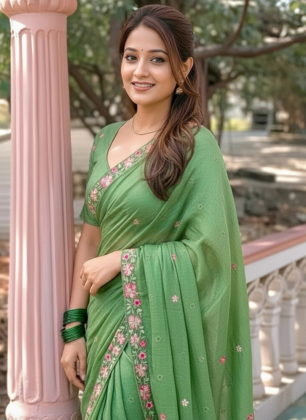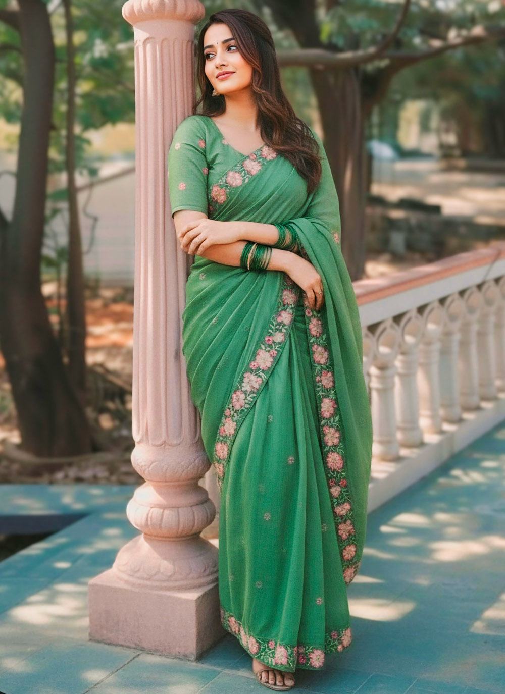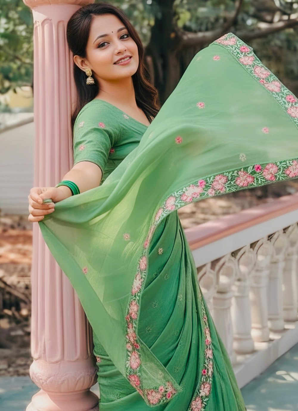Add a touch of elegance to your ethnic wardrobe with this designer green crush silk saree. The combination of embroidery and cut work gives it a refined and stylish appearance. Comes with matching blouse.