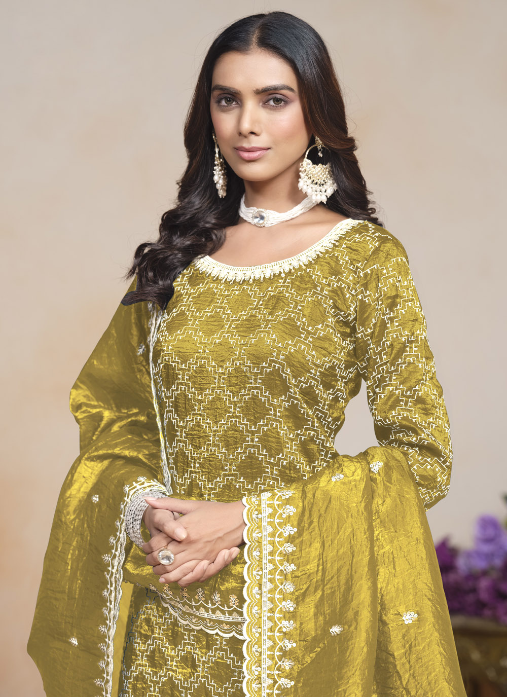Make a dazzling entrance in this green crush fabric salwar suit, delicately adorned with sequins and intricate embroidery. Its soft texture and lightweight feel ensure all-day comfort, while the shimmering embellishments add festive flair. Comes with matching bottom and dupatta.