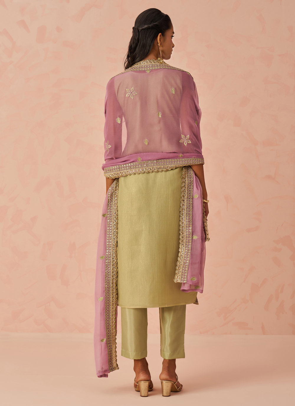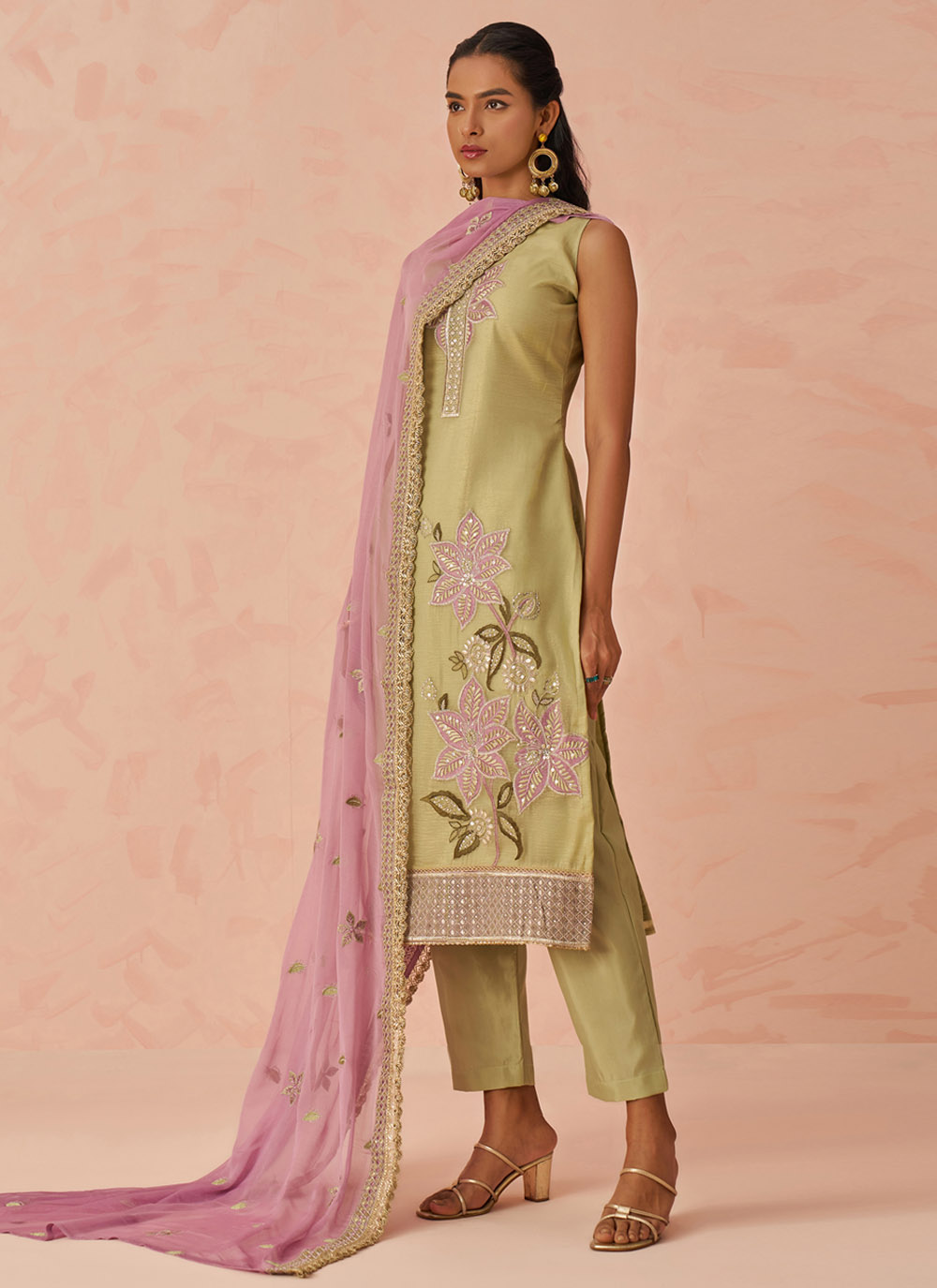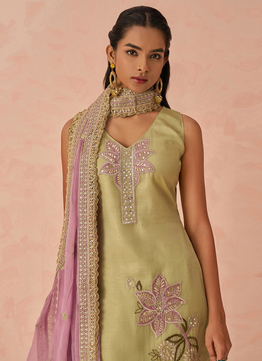 Crafted in fancy crush fabric, this Green Salwar Kameez comes adorned with delicate sequins embroidery that adds subtle glamour. this trendy ensemble is ideal for festive gatherings, family functions, or day-time events. Comes with matching bottom and dupatta.