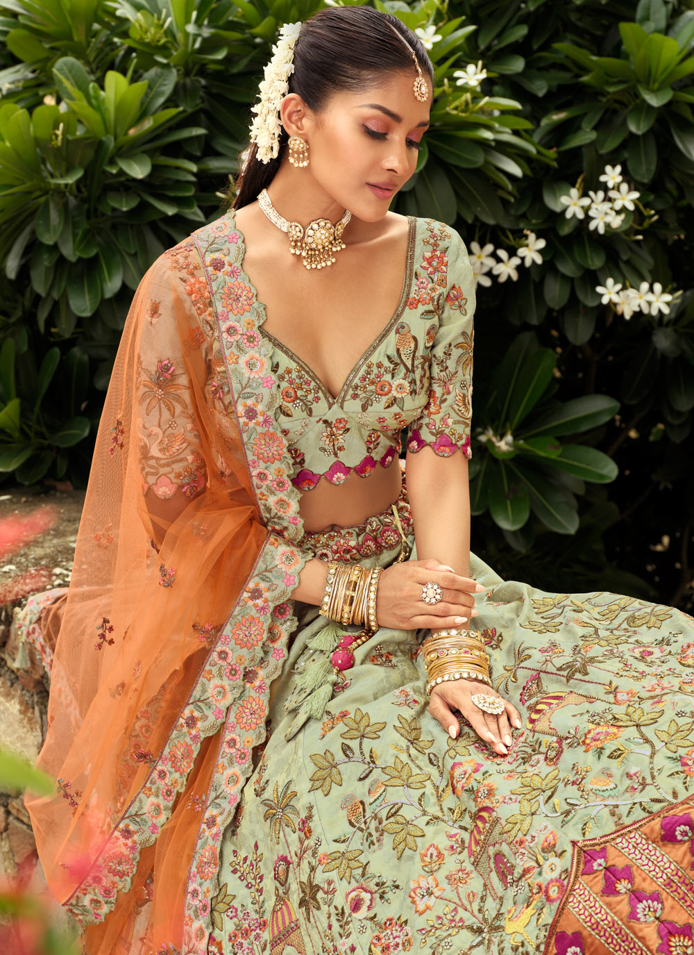 A masterpiece of traditional craftsmanship, this green designer lehenga choli is created using high-quality silk fabric. The intricate zari and thread embroidery blends seamlessly with sequins and stone embellishments. ideal for wedding receptions and grand celebrations. Comes with matching choli and dupatta.
