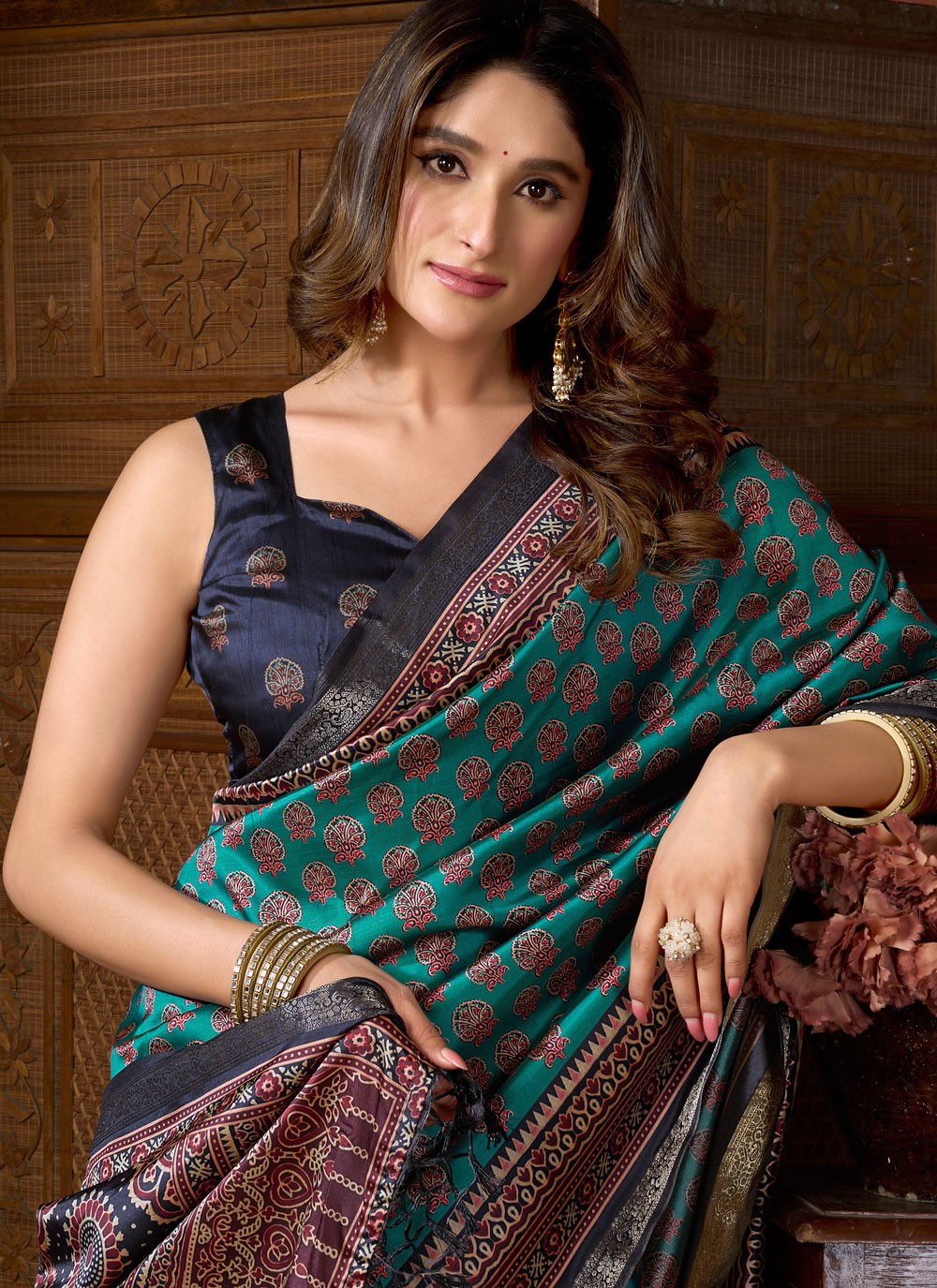 This green silk contemporary saree blends elegant digital prints with rich jacquard weaving to create a refined ethnic look. The smooth silk texture and artistic detailing make it perfect for modern festive styling. Comes with matching blouse.
