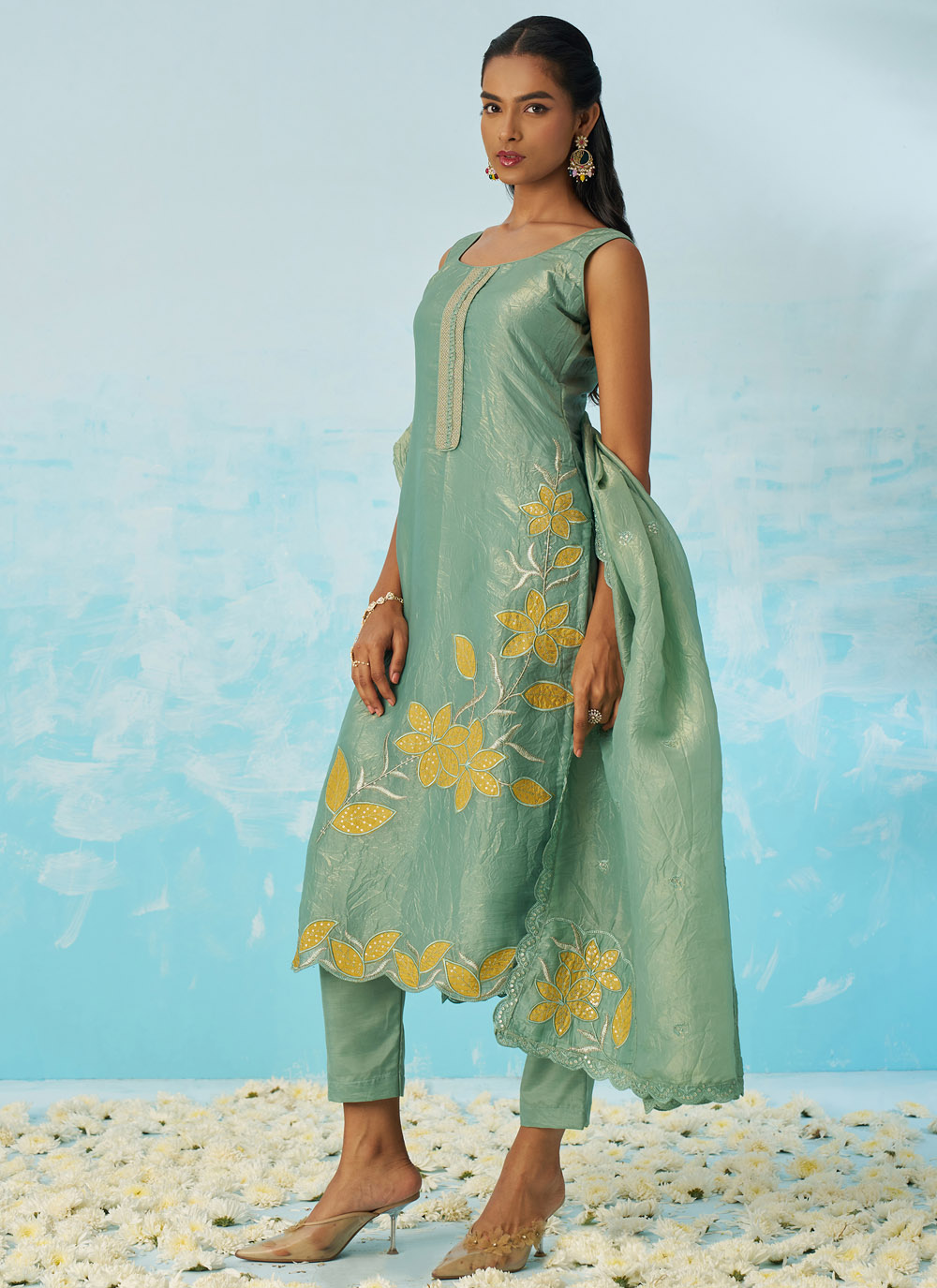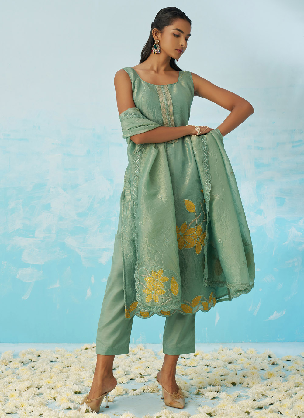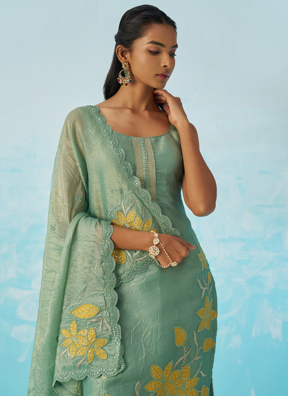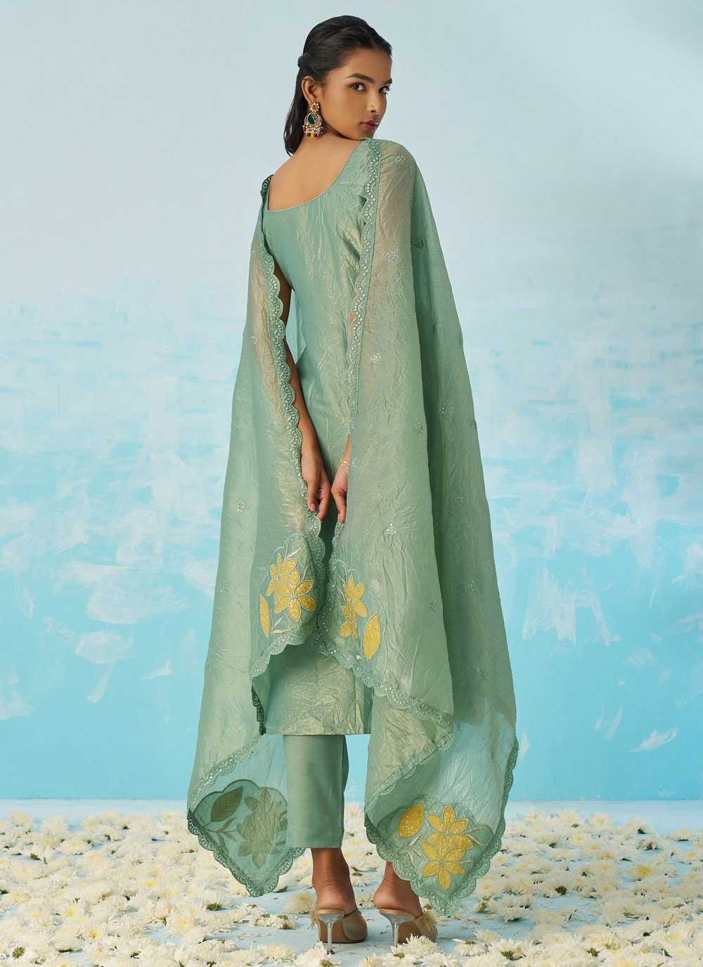 Radiate effortless charm in this green readymade salwar suit crafted from fancy crush fabric. The subtle texture of the fabric combined with fine machine embroidery creates a look that is perfect for festive gatherings, casual celebrations, and elegant daywear. Comes with matching bottom and dupatta.