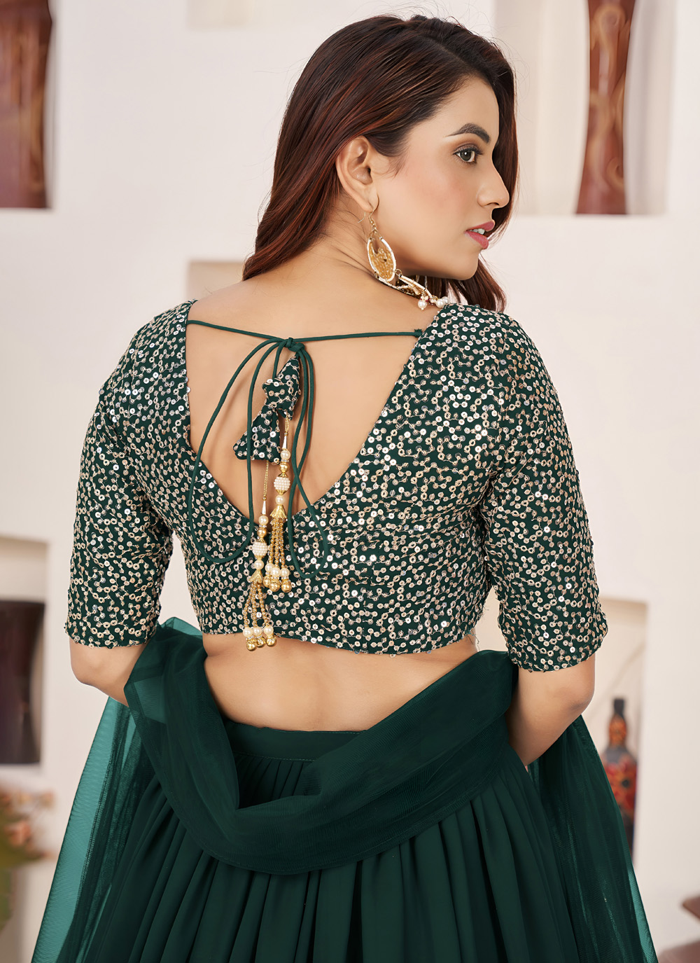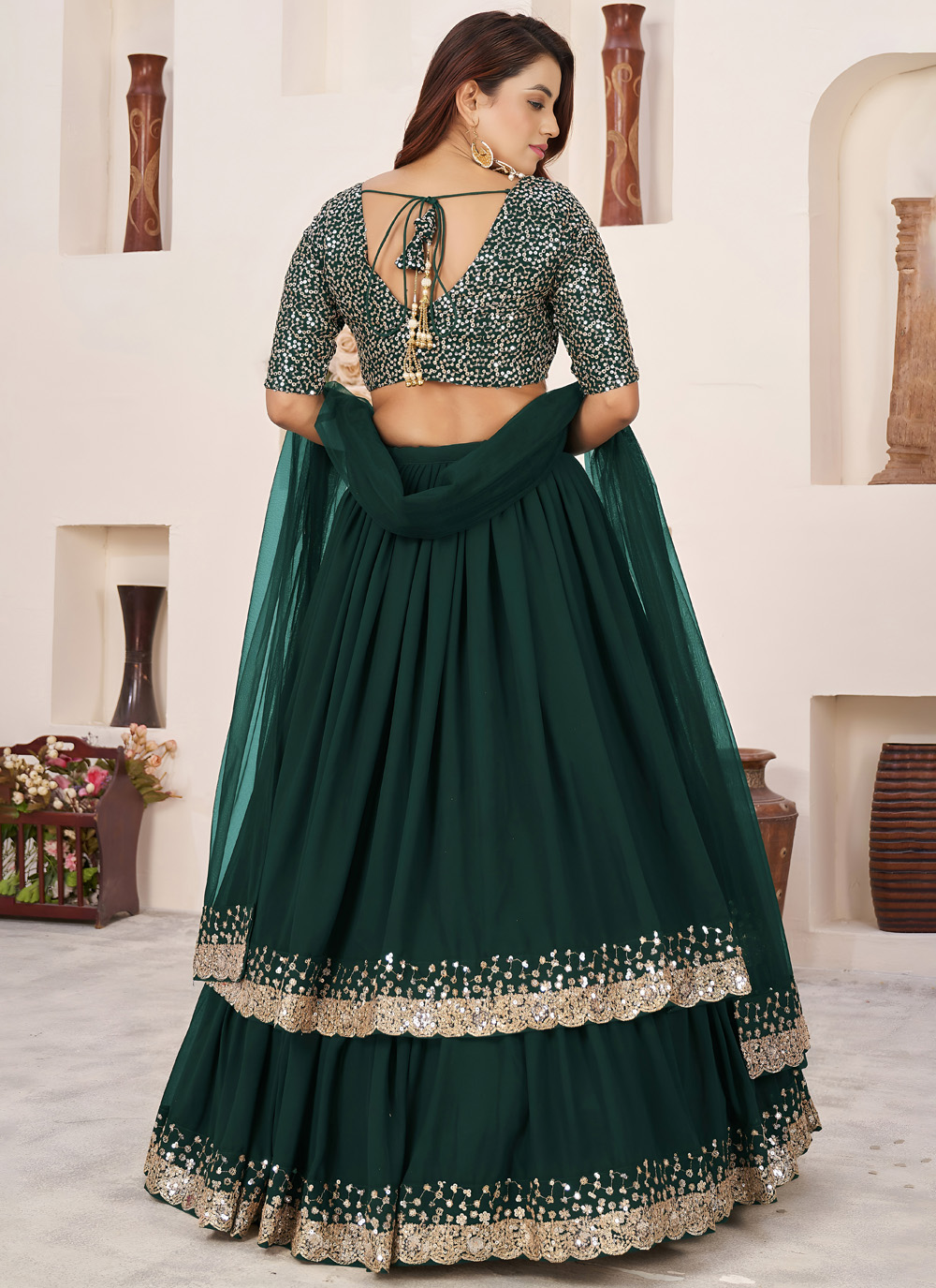 Add traditional charm to your festive wardrobe with this green embroidered georgette lehenga choli. The shimmering sequins and zari detailing enhance its beauty, creating a stunning outfit for grand celebrations. Comes with matching choli and dupatta.