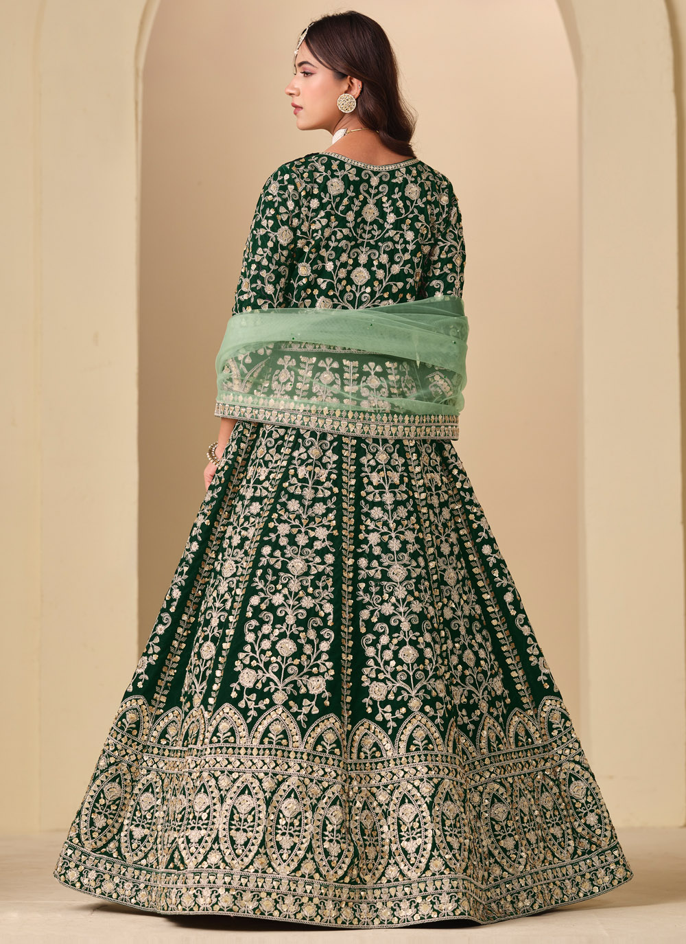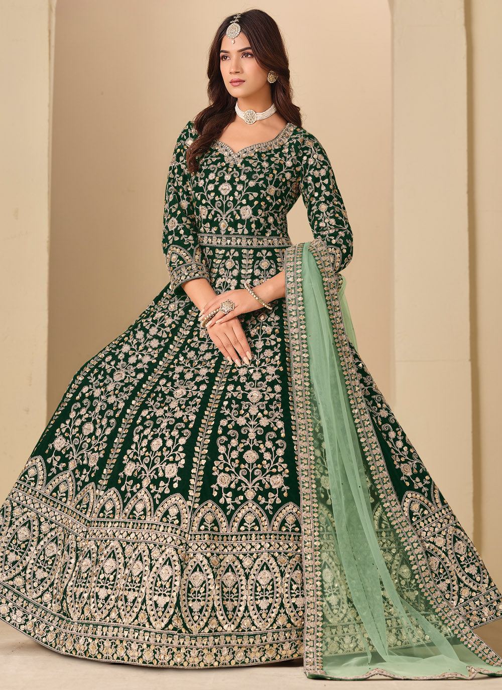 Add timeless charm to your ethnic collection with this green embroidered velvet Anarkali salwar suit. The soft velvet texture combined with elegant embroidery makes it a perfect choice for weddings and festive occasions. Comes with matching bottom and dupatta.